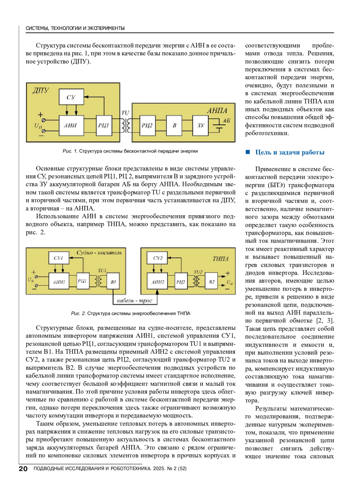 Системы энергообеспечения устройств подводной робототехники являются одними из базовых комплексов, решающих как вопросы передачи электроэнергии по длинной кабельной линии, например, на донные станции или на телеуправляемые необитаемые подводные аппараты (ТНПА), так и выполняющих бесконтактную передачу энергии для заряда аккумуляторных батарей автономных необитаемых подводных аппаратов (АНПА). В общем случае подобные системы содержат автономный инвертор напряжения, резонансные цепи, высокочастотный трансформатор для гальванического разделения и согласования параметров первичной и вторичной сторон, а также необходимые преобразующие устройства на вторичной стороне.