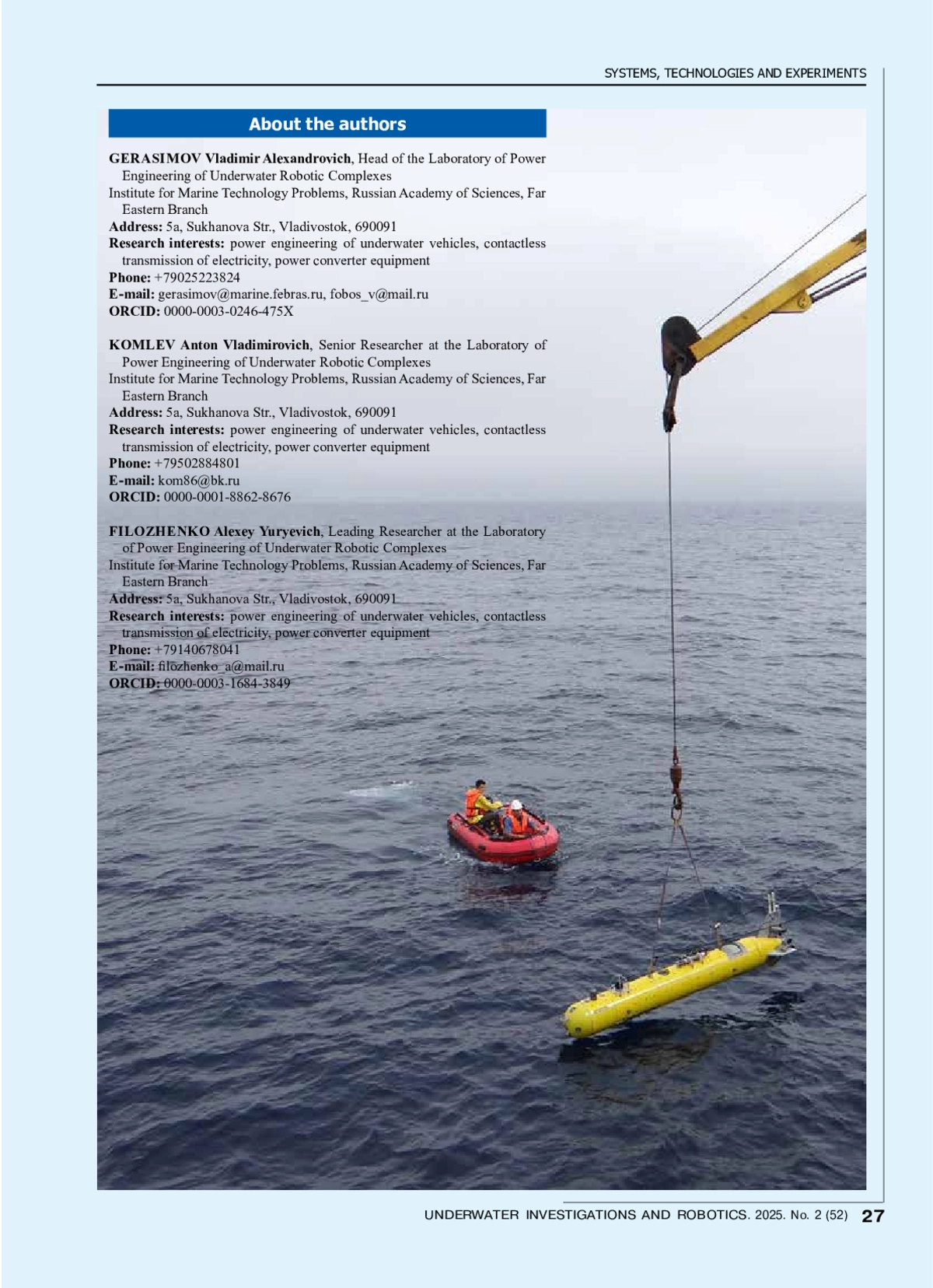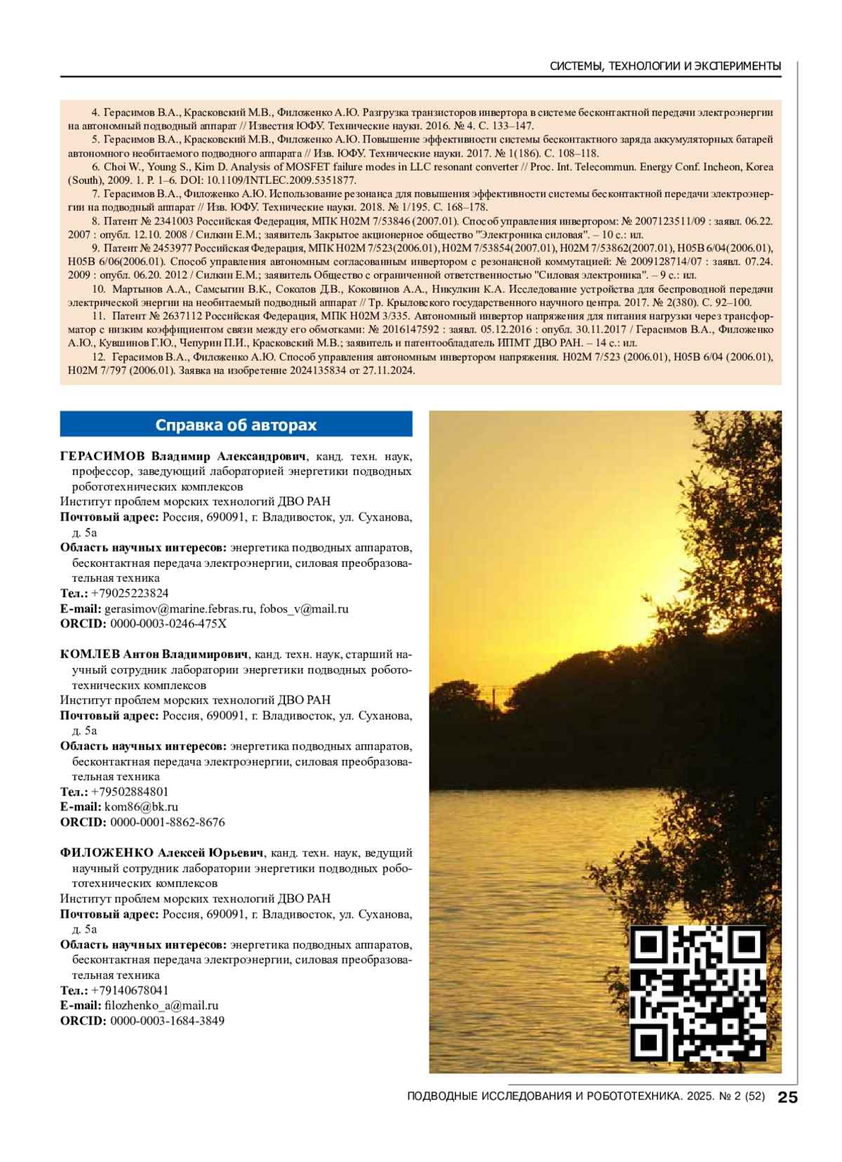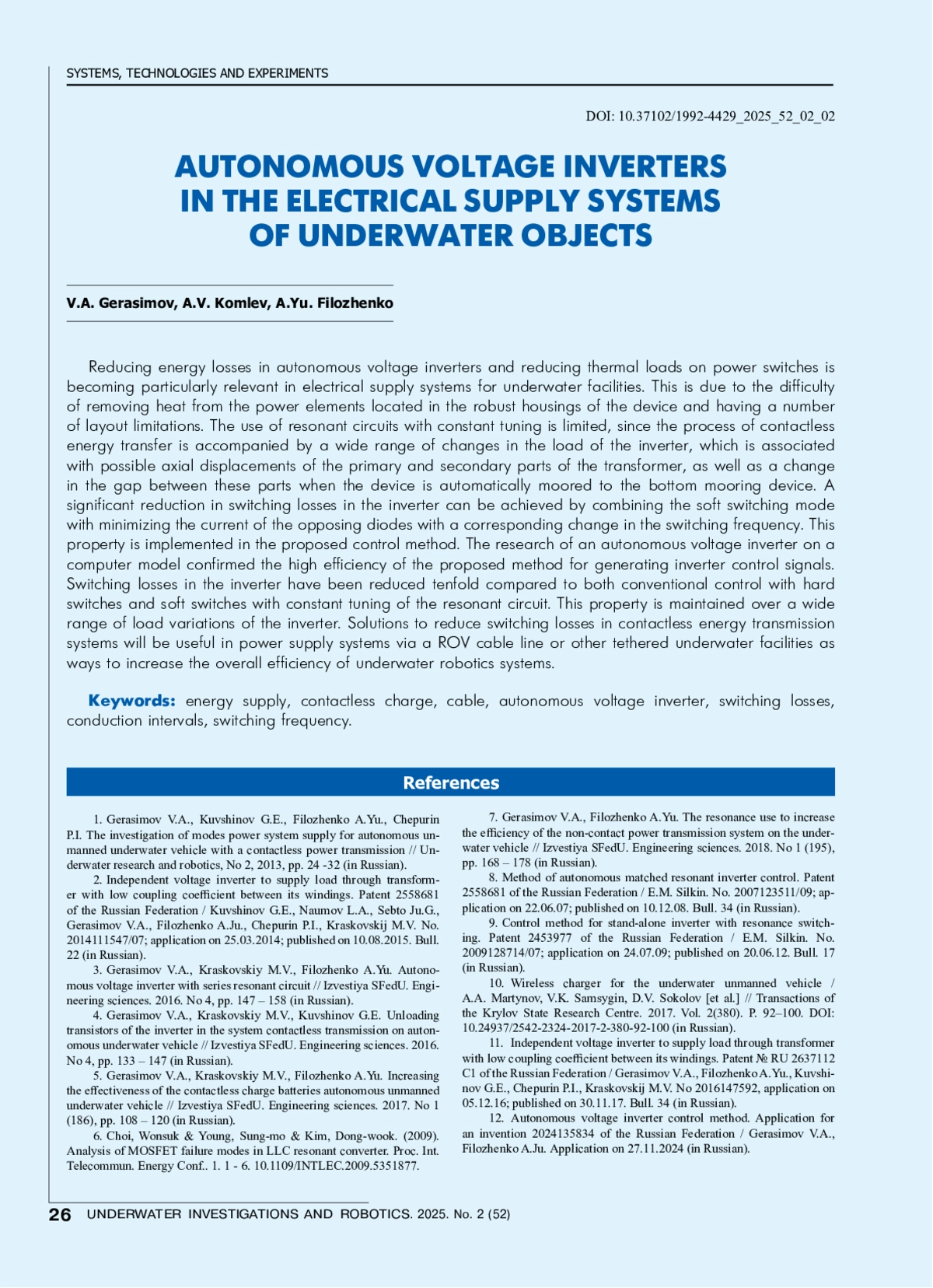 13. Gerasimov V.A., Kuvshinov G.E., Filozhenko A.Yu., Chepurin P.I. The investigation of modes power system supply for autonomous unmanned underwater vehicle with a contactless power transmission // Underwater research and robotics, No 2, 2013, pp. 24-32 (in Russian).