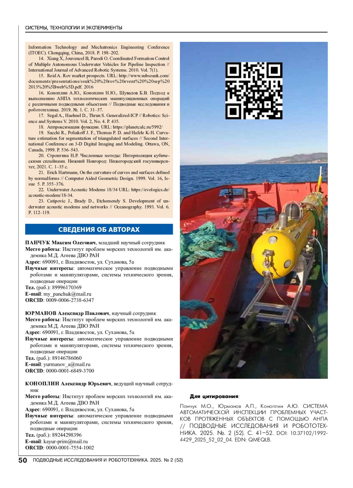 16. 	Коноплин А.Ю., Коноплин Н.Ю., Шувалов Б.В. Подход к выполнению АНПА технологических манипуляционных операций с различными подводными объектами // Подводные исследования и робототехника. 2019. №. 1. С. 31-37.