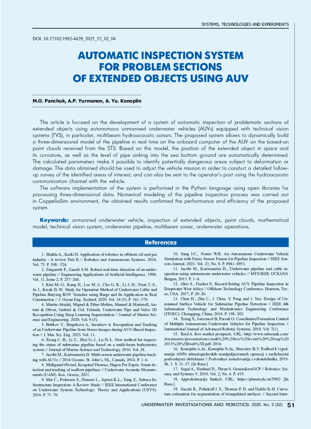 Статья посвящена разработке системы автоматической инспекции проблемных участков протяженных объектов с использованием автономных необитаемых подводных аппаратов (АНПА), оснащенных системами технического зрения (СТЗ), в частности многолучевыми гидроакустическими сонарами. Предложенная система позволяет в режиме реального времени на бортовом ЭВМ АНПА динамически строить трехмерную модель трубопровода на основе облаков точек, получаемых от СТЗ. На основе указанной модели автоматически определяются положение протяженного объекта в пространстве и его кривизна, а также уровень погружения трубы в донный грунт. Вычисленные параметры позволяют выявлять потенциально опасные участки, подверженные деформациям или повреждениям. Полученные данные должны использоваться для корректировки миссии аппарата с целью проведения детального дообследования выявленных зон интереса, а также могут быть отправлены на пост оператора с использованием гидроакустического канала связи с аппаратом.