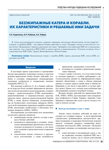 В статье рассматриваются вопросы создания надводных автономных безэкипажных систем (средств) - катеров и кораблей (БЭК) - для ведения боевых действий на море. Проведен анализ их достоинств и недостатков. Сформирован перечень решаемых ими задач. Приведена классификация БЭК как по решаемым ими задачам, так и принятая в ВМС США по длине корпуса и водоизмещению. Описаны основные типы и характеристики БЭК США, Турции, Великобритании, Южной Кореи.