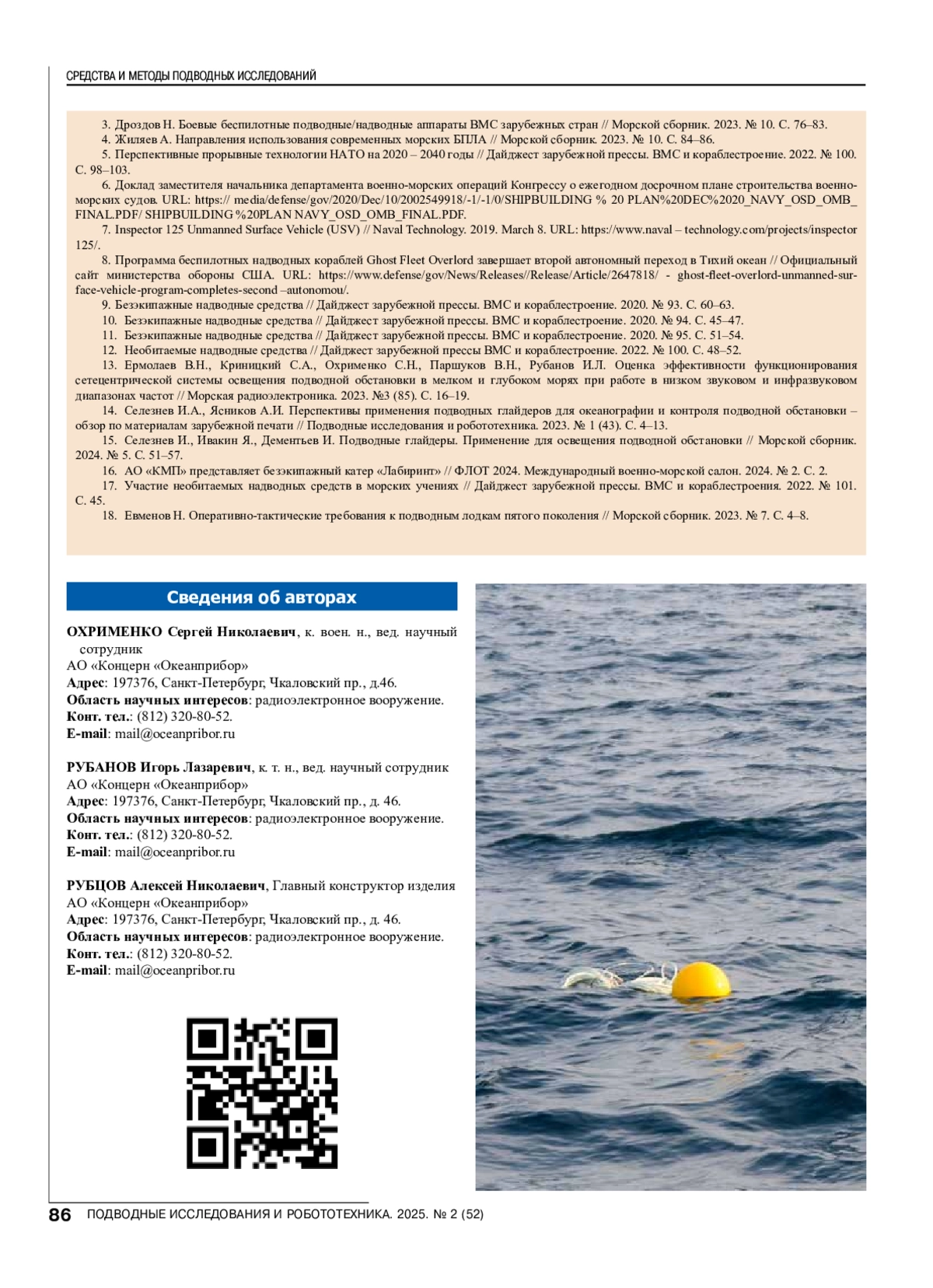 15. 	Селезнев И., Ивакин Я., Дементьев И. Подводные глайдеры. Применение для освещения подводной обстановки // Морской сборник. 2024. № 5. С. 51-57.