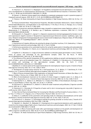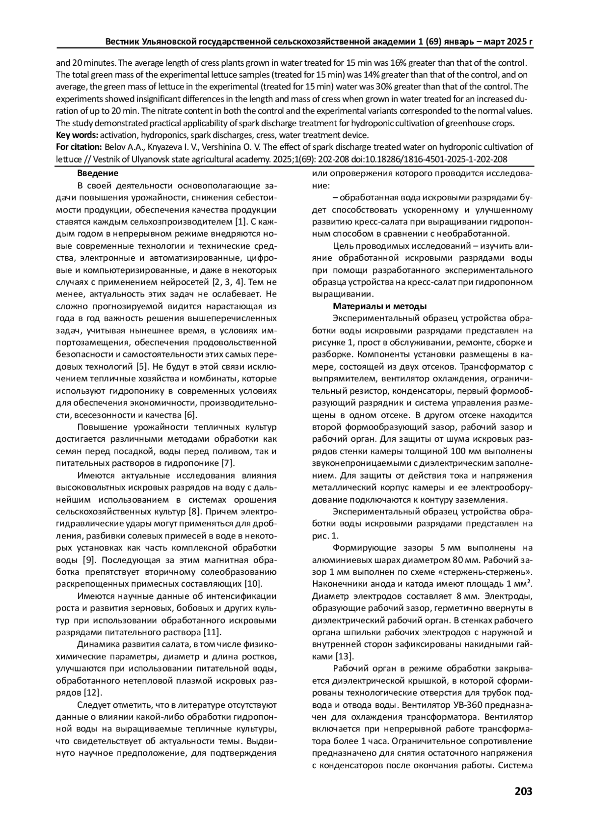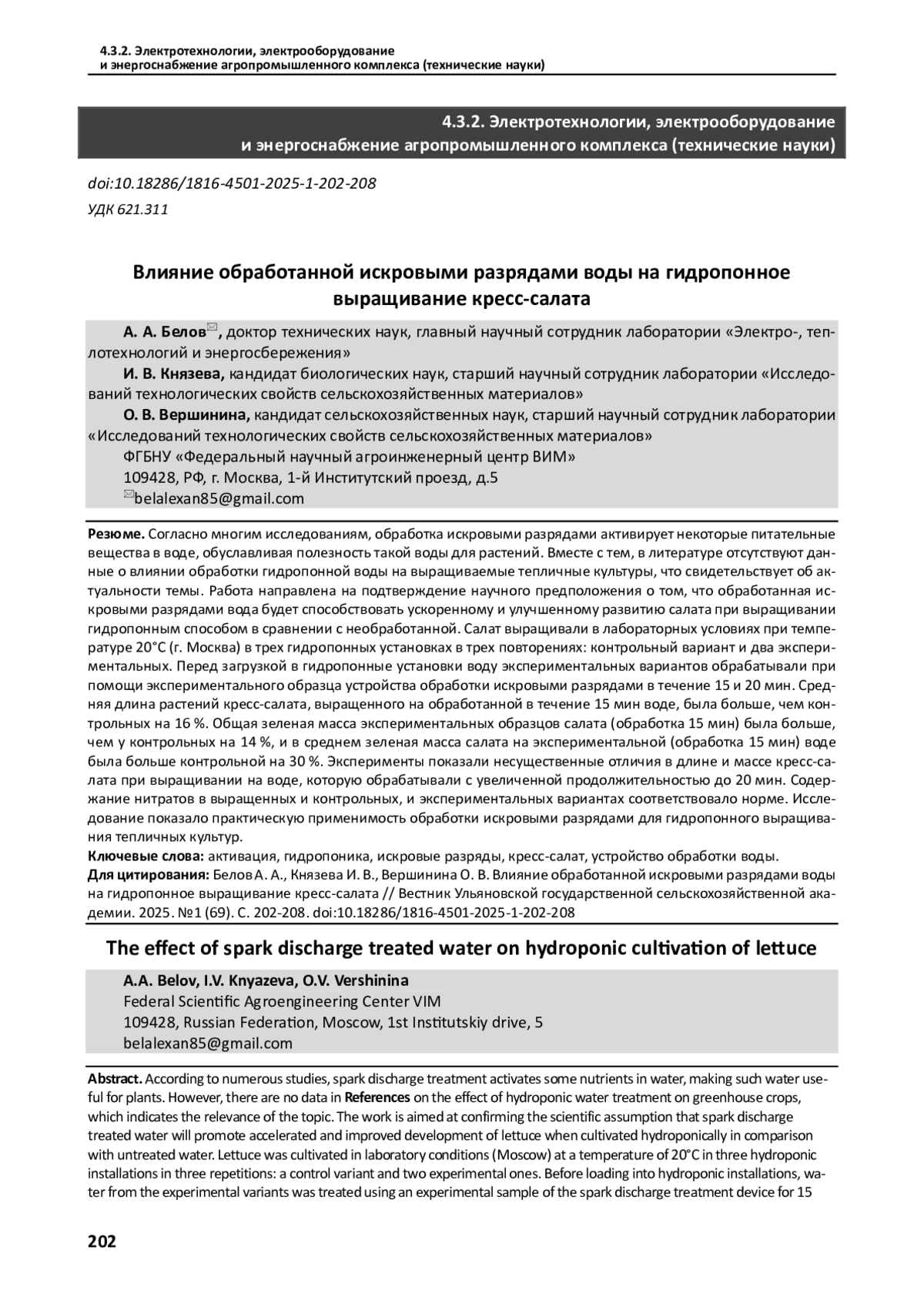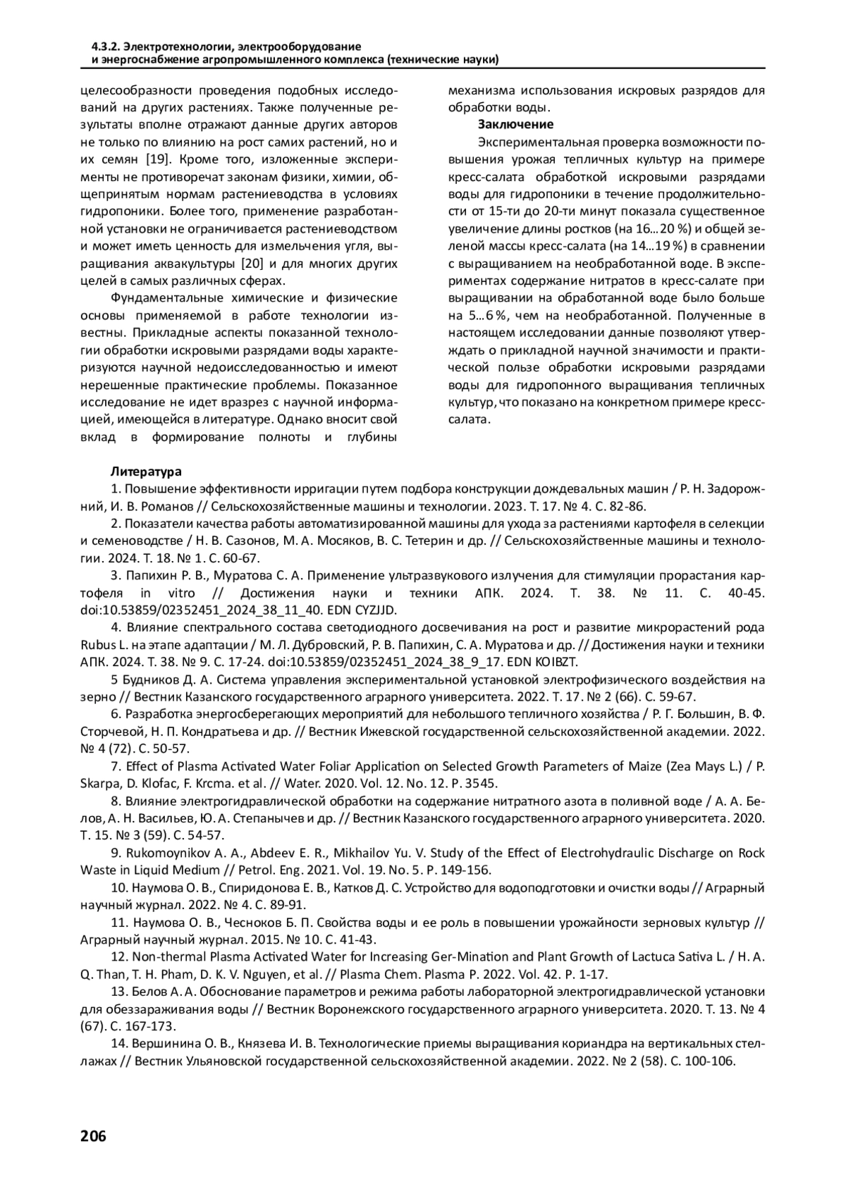 16. Белов А. А. Влияние полива водой после обработки искровыми разрядами на рост и развитие редиса // Аграрный научный журнал. 2023. № 10. С. 21-25. DOI: 10.28983/asj.y2023i10pp21-25 EDN: JGYHAM