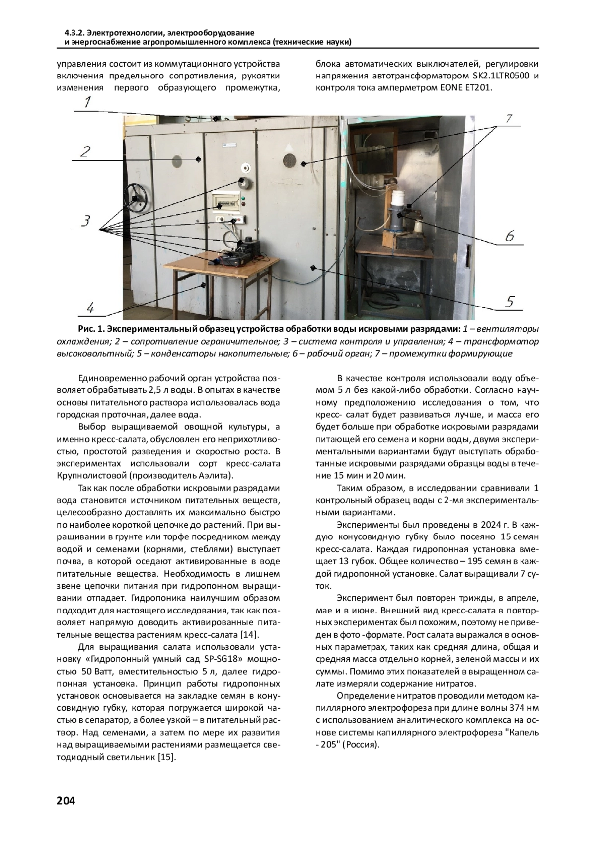 Согласно многим исследованиям, обработка искровыми разрядами активирует некоторые питательные вещества в воде, обуславливая полезность такой воды для растений. Вместе с тем, в литературе отсутствуют данные о влиянии обработки гидропонной воды на выращиваемые тепличные культуры, что свидетельствует об актуальности темы. Работа направлена на подтверждение научного предположения о том, что обработанная искровыми разрядами вода будет способствовать ускоренному и улучшенному развитию салата при выращивании гидропонным способом в сравнении с необработанной. Салат выращивали в лабораторных условиях при температуре 20°С (г. Москва) в трех гидропонных установках в трех повторениях: контрольный вариант и два экспериментальных. Перед загрузкой в гидропонные установки воду экспериментальных вариантов обрабатывали при помощи экспериментального образца устройства обработки искровыми разрядами в течение 15 и 20 мин. Средняя длина растений кресс-салата, выращенного на обработанной в течение 15 мин воде, была больше, чем контрольных на 16 %. Общая зеленая масса экспериментальных образцов салата (обработка 15 мин) была больше, чем у контрольных на 14 %, и в среднем зеленая масса салата на экспериментальной (обработка 15 мин) воде была больше контрольной на 30 %. Эксперименты показали несущественные отличия в длине и массе кресс-салата при выращивании на воде, которую обрабатывали с увеличенной продолжительностью до 20 мин. Содержание нитратов в выращенных и контрольных, и экспериментальных вариантах соответствовало норме. Исследование показало практическую применимость обработки искровыми разрядами для гидропонного выращивания тепличных культур