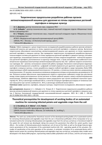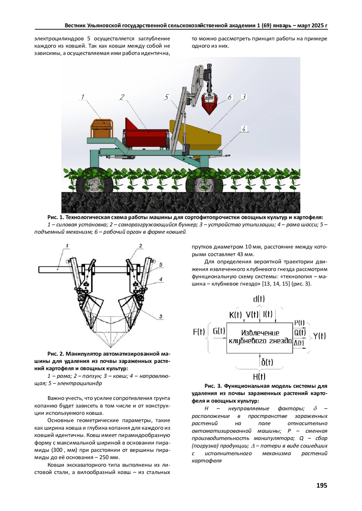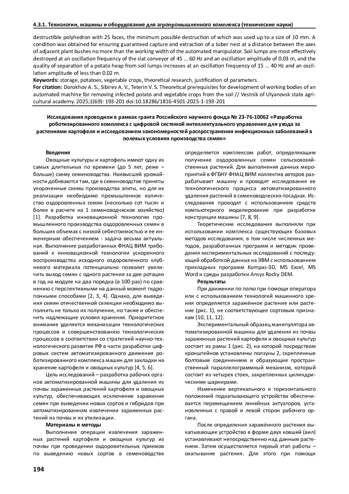 Работу проводили с целью теоретических исследований разрабатываемых рабочих органов автоматизированной машины для удаления из почвы зараженных растений картофеля и овощных культур. Выполнено теоретическое обоснование манипулятора автоматизированной машины для удаления из почвы зараженных растений картофеля и овощных культур. При проведении теоретических исследований разработана функциональная модель системы для удаления из почвы зараженных растений картофеля и овощных культур, учитывающая параметры, оказывающие влияние на качество работы системы: входные воздействия - количество зараженных растений картофеля, расположенных на единицу площади поля, а также конструктивные особенности (геометрические параметры) манипулятора автоматизированной машины k(t), V(t) - рабочие скорости исполнительных приводов, I(t) - режимы согласования совместной работы приводов. Выполнено компьютерное моделирование автоматизированного устройства с цифровой системой управления для удаления зараженных растений картофеля и овощных культур, а также разработаны модели клубней картофеля в среде программы Rocky DEM, представляющие собой неразрушаемый многогранник с 23 гранями, а почвенные комки являлись разрушаемым многогранником с 25 гранями, минимально возможное разрушение которых использовалось до размерности 10 мм. Получено условие обеспечения гарантированного захвата и извлечения клубневого гнезда при расстоянии между осями рядом расположенных кустов растения не более рабочей ширины захвата автоматизированного манипулятора. Наиболее эффективно почвенные комки разрушаются при частоте колебаний планчатого транспортёра 45…60 Гц и амплитуде колебаний 0,03 м, а качество сепарации картофельного вороха от почвенных комков повышается при частоте колебаний 15.40 Гц и амплитуде колебаний менее 0,02 м.