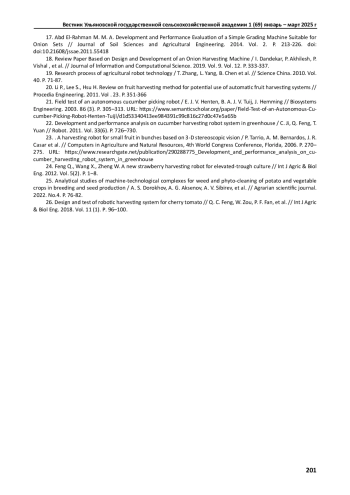 20. 	Li P, Lee S, Hsu H. Review on fruit harvesting method for potential use of automatic fruit harvesting systems // Procedia Engineering. 2011. Vol. 23: P. 351-366.