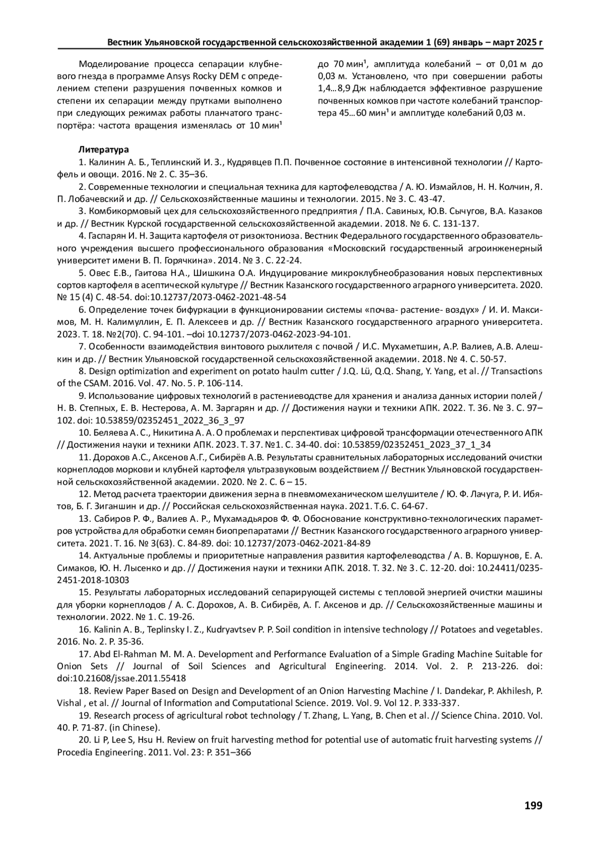 16. 	Kalinin A. B., Teplinsky I. Z., Kudryavtsev P. P. Soil condition in intensive technology // Potatoes and vegetables. 2016. No. 2. P. 35-36.