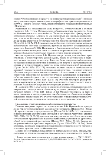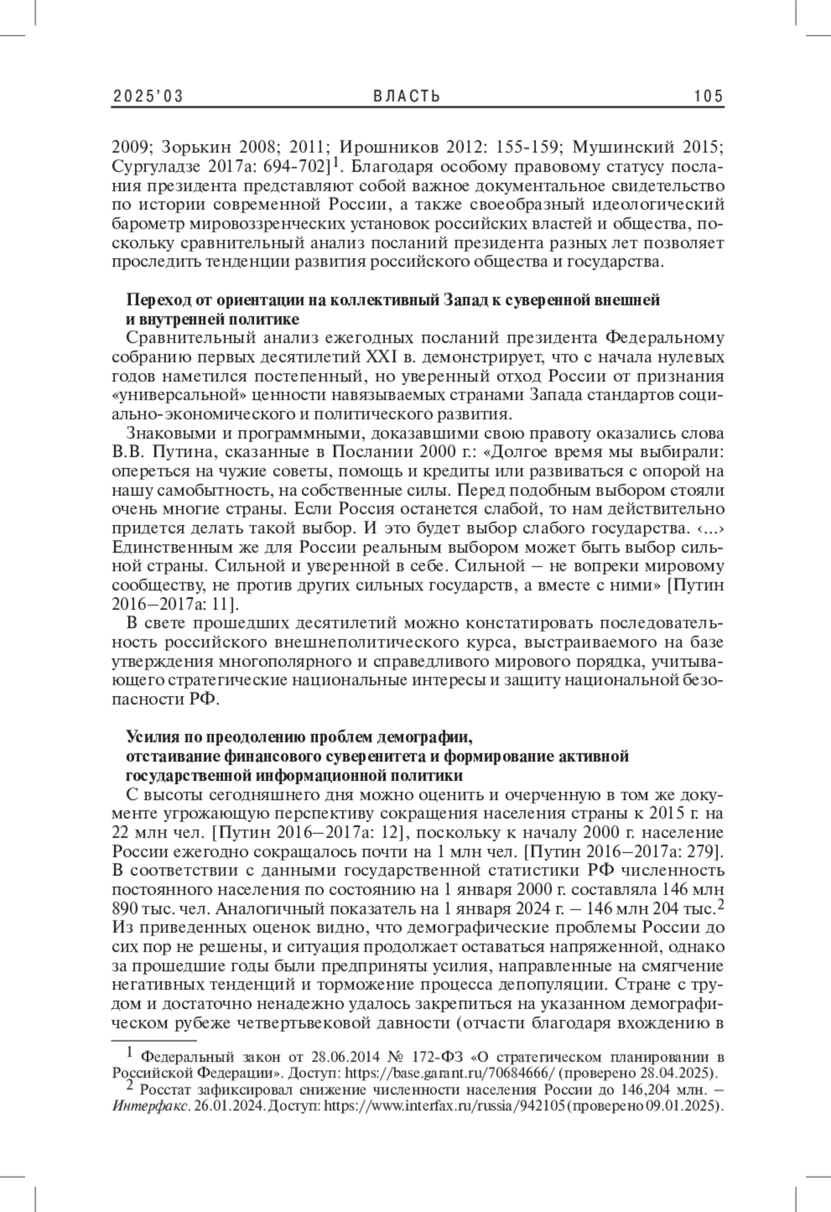 6. 	Зорькин В.Е. 2011. Ежегодные Послания Федеральному Собранию Российской Федерации как средство формирования и реализации правовой политики Президента Российской Федерации: автореф. дис. … к.ю.н. СПб: Юридический институт. 27 с. EDN: QHKRXV
