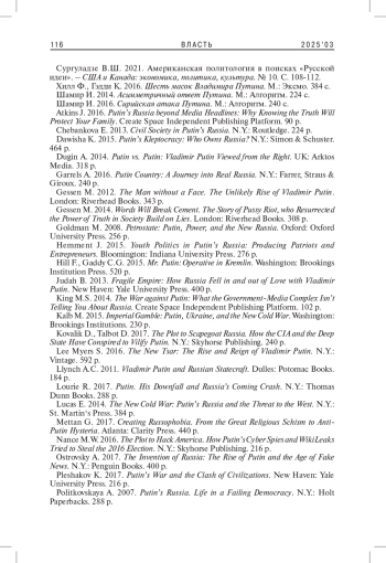 44. 	Сургуладзе В.Ш. 2021. Американская политология в поисках “Русской идеи”. - США и Канада: экономика, политика, культура. № 10. С. 108-112.