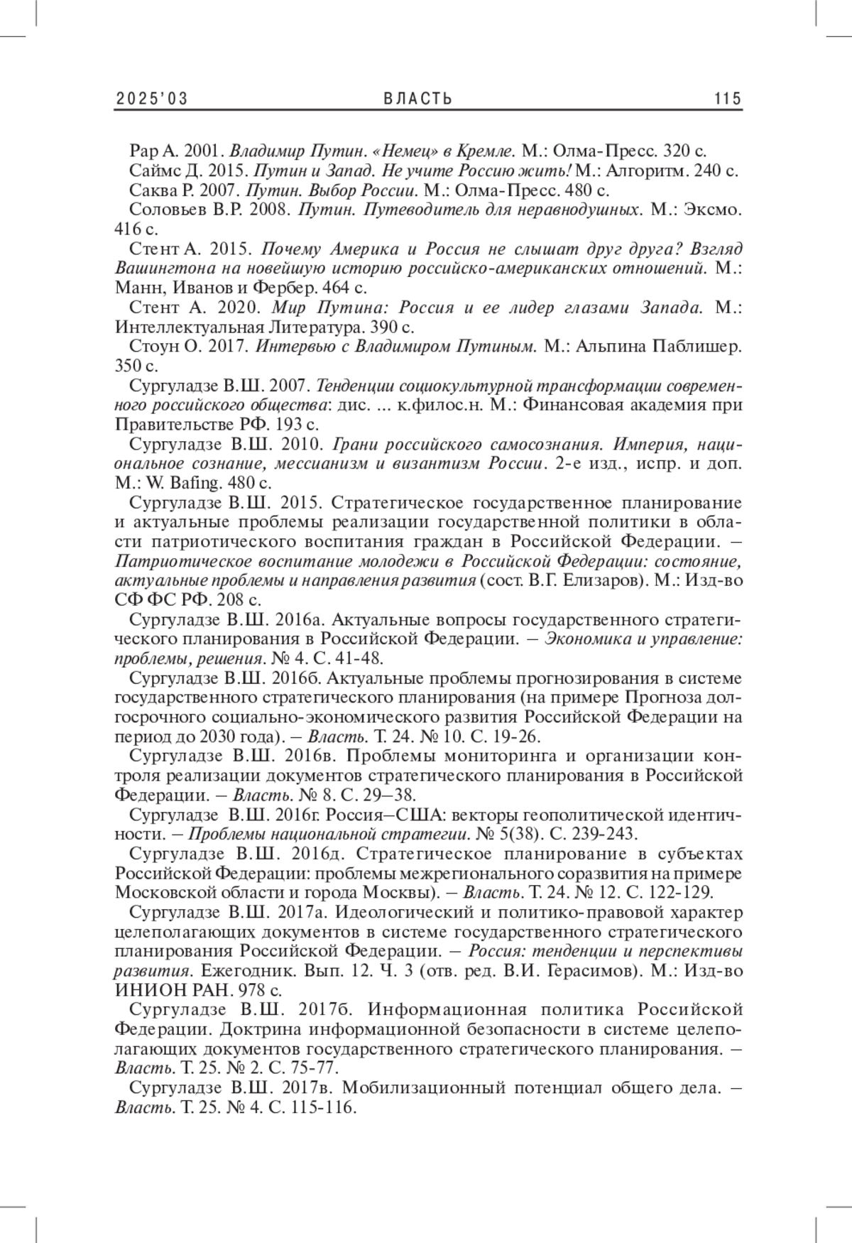 36. 	Сургуладзе В.Ш. 2016а. Актуальные вопросы государственного стратегического планирования в Российской Федерации. - Экономика и управление: проблемы, решения. № 4. С. 41-48. EDN: VWSHKB
