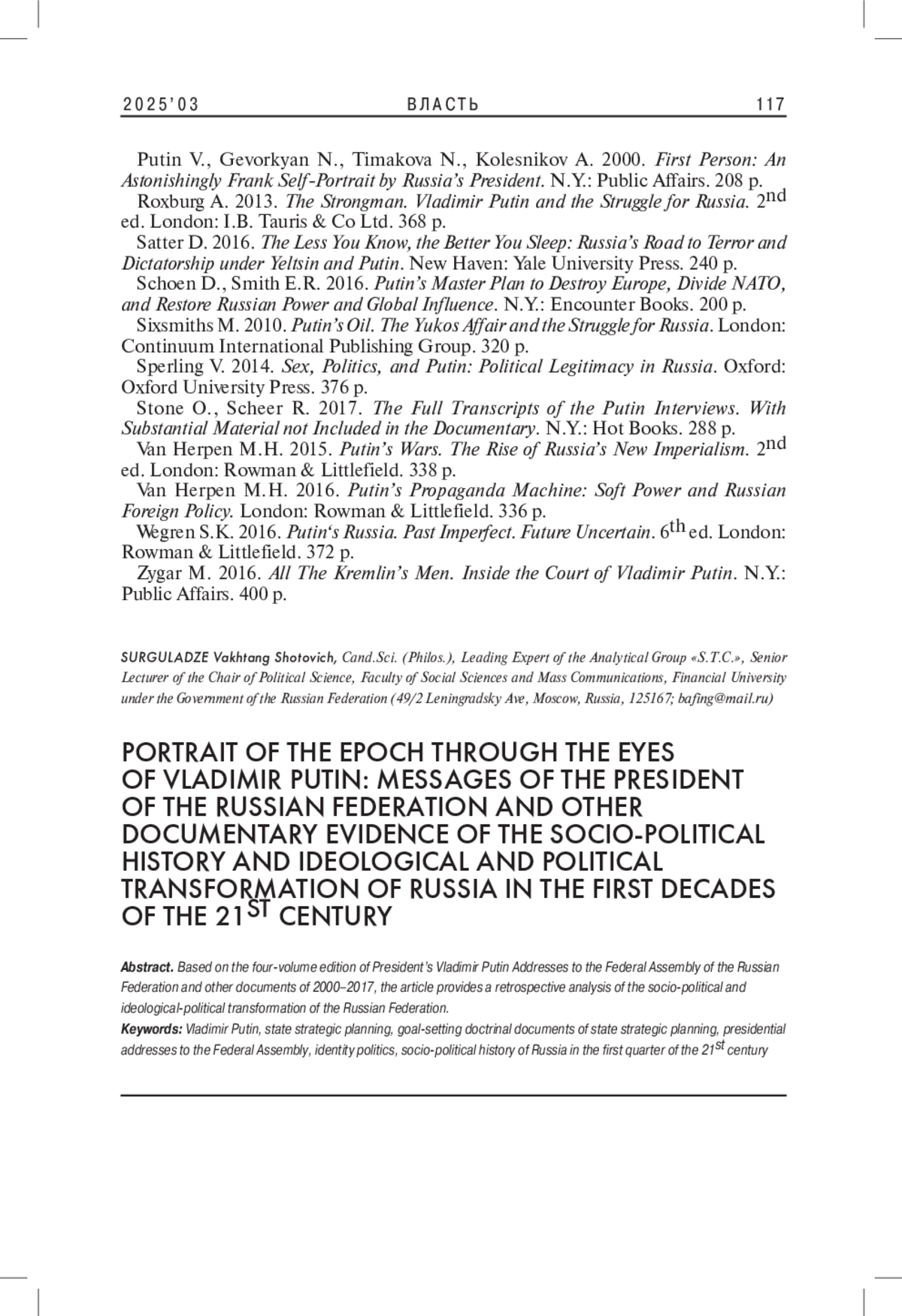 41. 	Сургуладзе В.Ш. 2017а. Идеологический и политико-правовой характер целеполагающих документов в системе государственного стратегического планирования Российской Федерации. - Россия: тенденции и перспективы развития. Ежегодник. Вып. 12. Ч. 3 (отв. ред. В.И. Герасимов). М.: Изд-во ИНИОН РАН. 978 с.