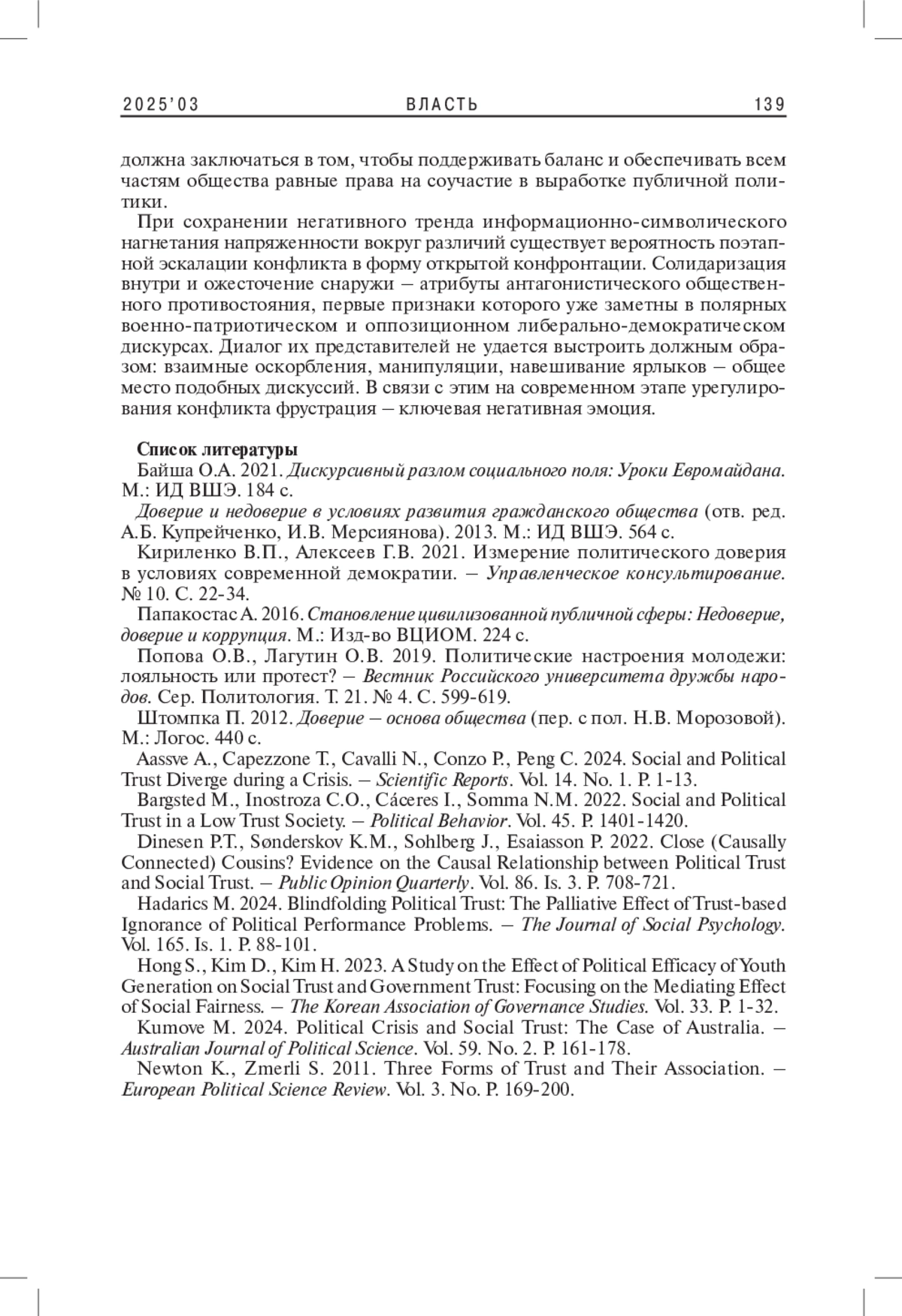 8. 	Bargsted M., Inostroza C.O., Cáceres I., Somma N.M. 2022. Social and Political Trust in a Low Trust Society. - Political Behavior. Vol. 45. P. 1401-1420. EDN: CFDKFW