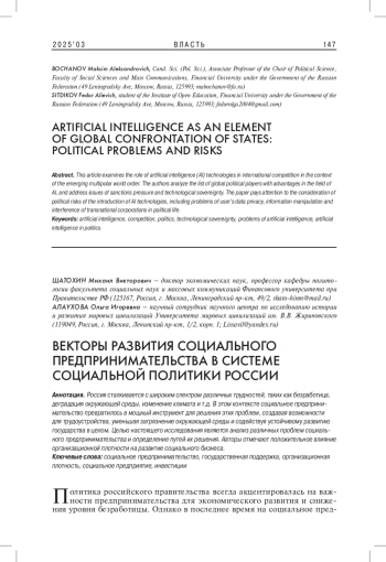 В данной статье исследуется роль технологий искусственного интеллекта (ИИ) в международной конкуренции в условиях формирующегося многополярного миропорядка. Авторы анализируют перечень игроков мировой политики, обладающих преимуществами в сфере ИИ, а также затрагивают вопросы санкционного давления и технологического суверенитета, уделяя внимание рассмотрению политических рисков внедрения технологий ИИ, включающих в себя проблемы приватности пользовательских данных, информационных манипуляций и вмешательства транснациональных корпораций в политическую жизнь.