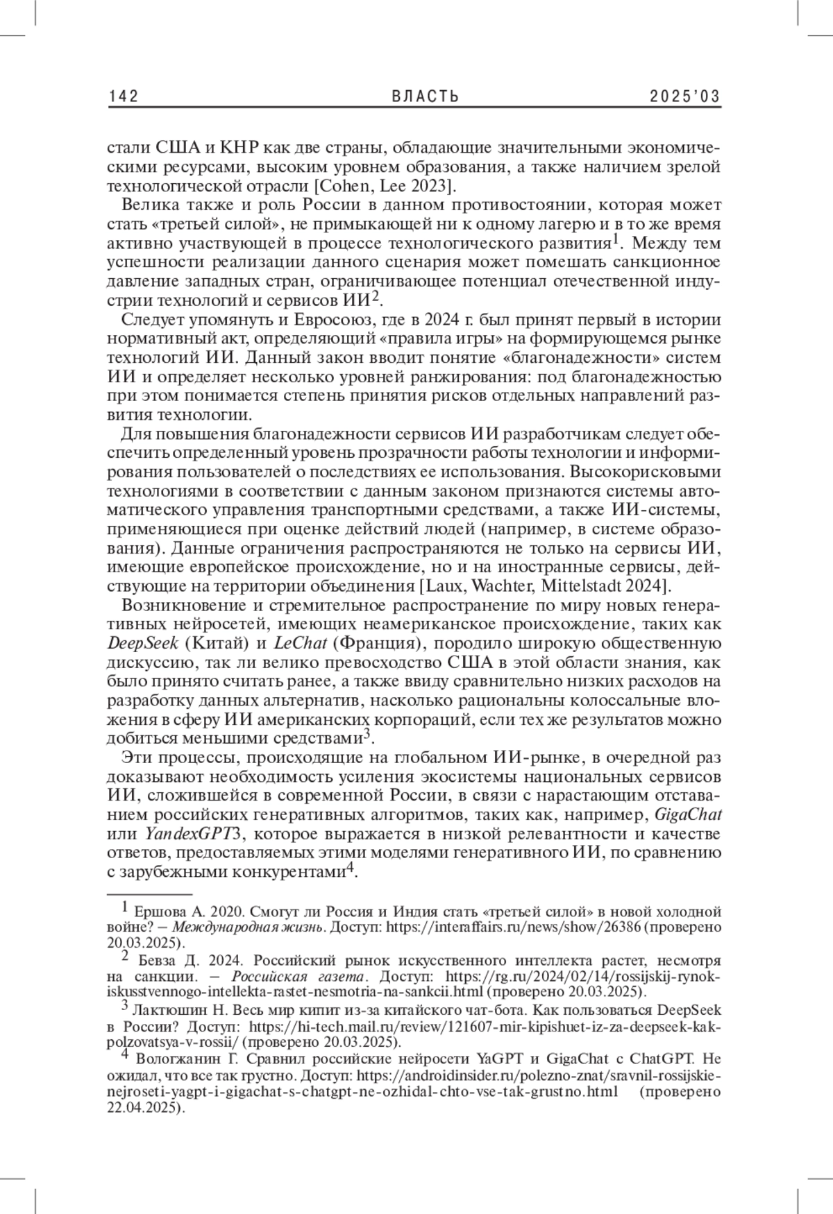 6. 	Cohen Ja., Lee D. 2023. The Generative World Order: AI, Geopolitics, and Power. - Goldman Sachs Global Institute. URL: https://www.goldmansachs.com/insights/articles/the-generative-world-order-ai-geopolitics-and-power ( accessed 22.04.2025).