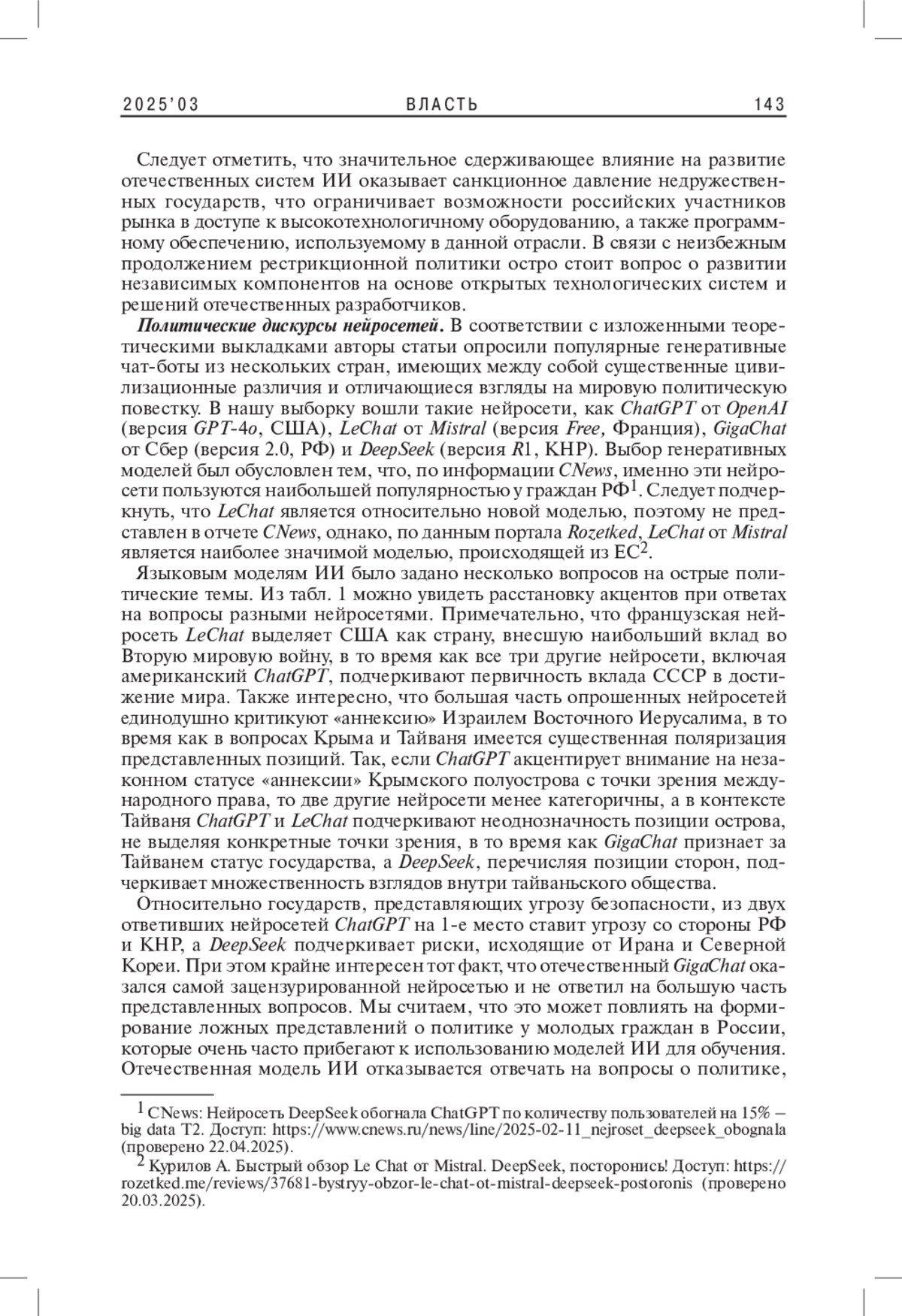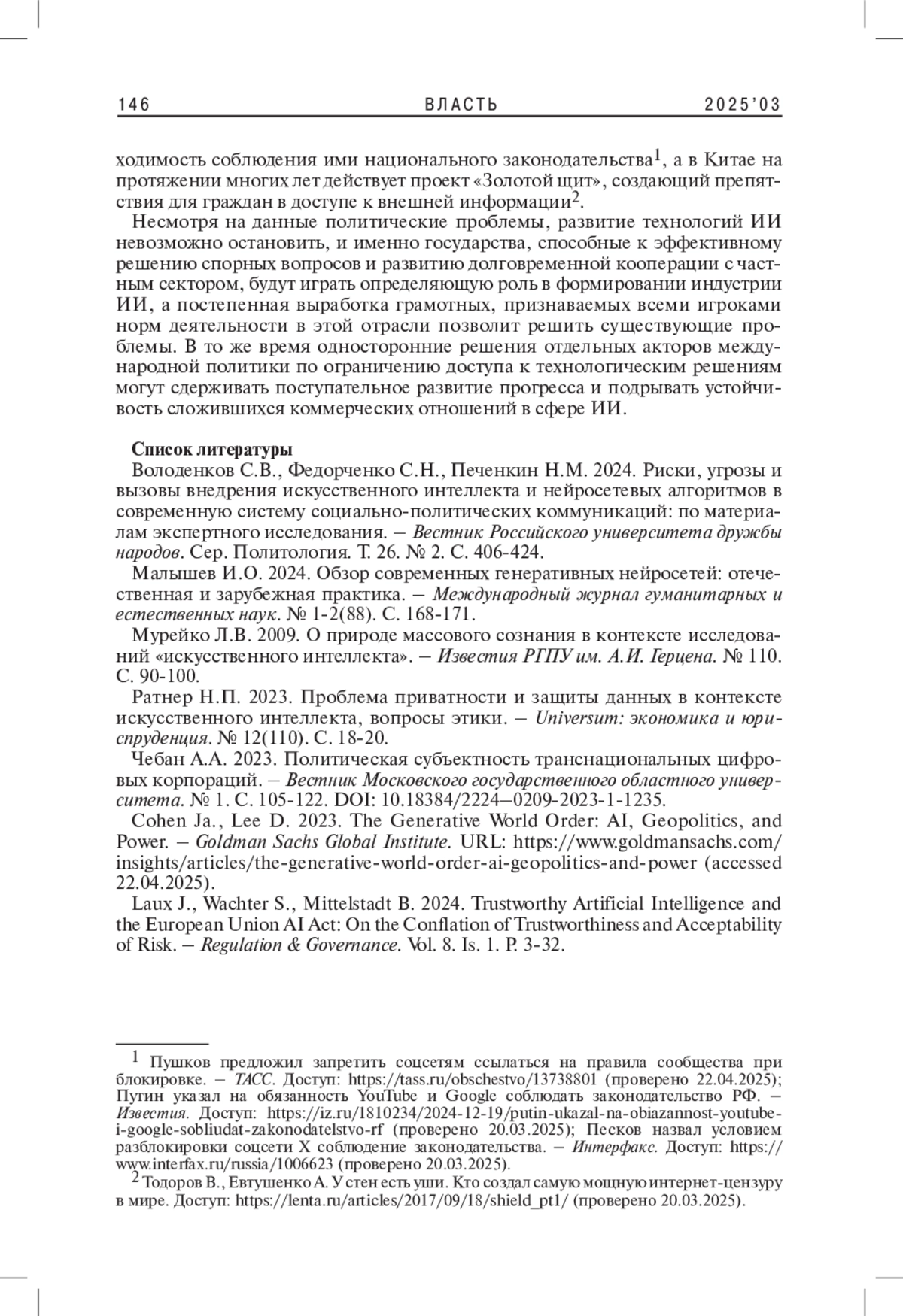 1. 	Володенков С.В., Федорченко С.Н., Печенкин Н.М. 2024. Риски, угрозы и вызовы внедрения искусственного интеллекта и нейросетевых алгоритмов в современную систему социально-политических коммуникаций: по материалам экспертного исследования. - Вестник Российского университета дружбы народов. Сер. Политология. Т. 26. № 2. С. 406-424. EDN: LWSYCV