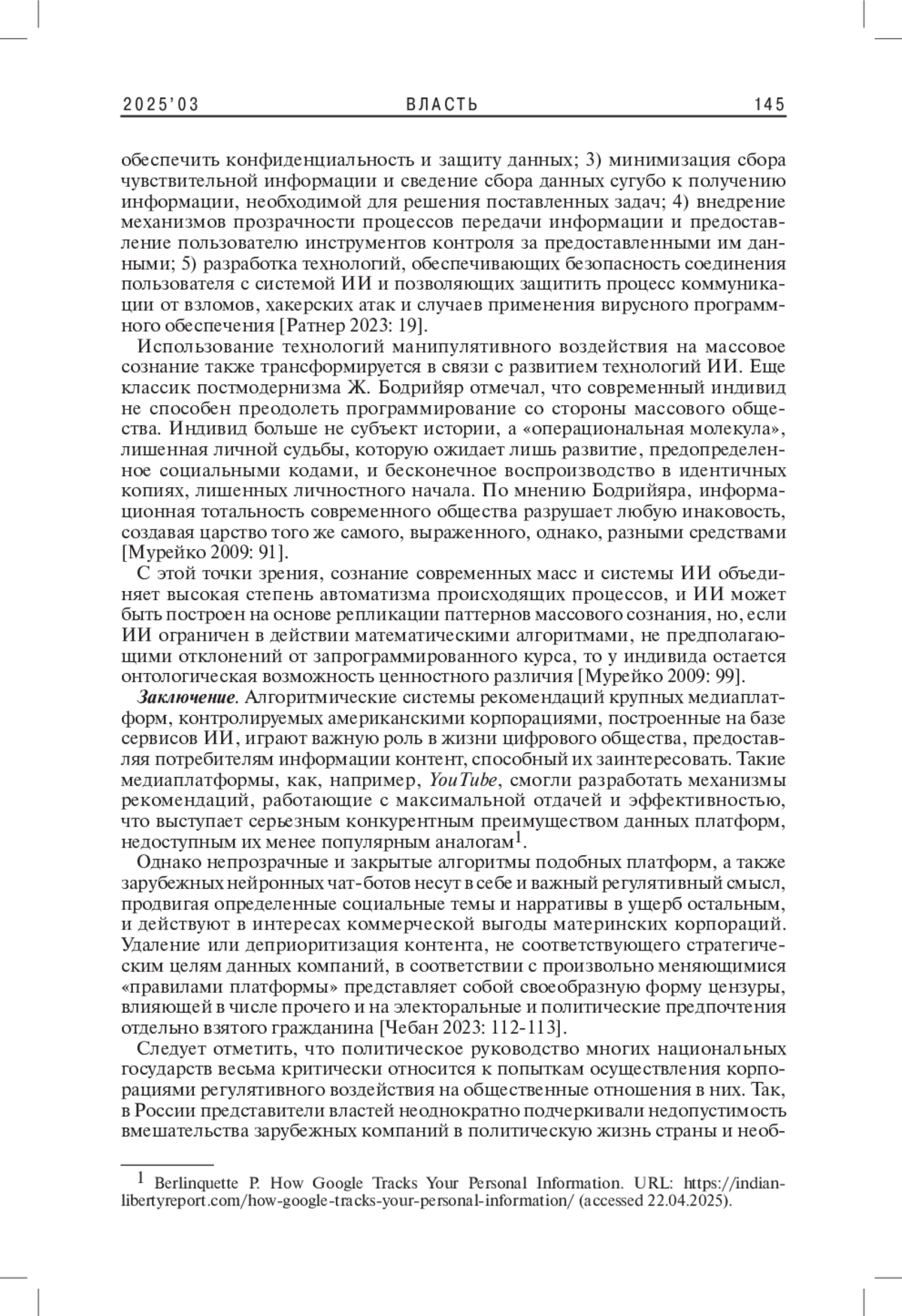 4. 	Ратнер Н.П. 2023. Проблема приватности и защиты данных в контексте искусственного интеллекта, вопросы этики. - Universum: экономика и юриспруденция. № 12(110). С. 18-20. EDN: IPKBPO