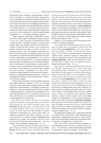 Семантический блок социальных маркем (СеБ СоцМ) образуют слова, связанные с разного рода взаимоотношениями человека и социума, общественным устройством и проблемами. Состав СеБ СоцМ определяют 3 маркемы: inconvenience ‘неудобство’ (0,1688), punishment ‘кара, наказание’ (0,1539), experience ‘(жизненный) опыт’ (0,1504). Все три маркемы являются ядерными и относятся к ПЯ. Семантический блок морально-этических маркем (СеБ МорЭтМ) характеризует лексика, в которой находят отражение моральные и нравственные ценности общества и эпохи. Среди маркем романа Аретина обнаруживаются две морально-этических маркемы – conscience ‘совесть’ (0,1241) и generosity ‘благородство, великодушие’ (0,0824). Обе маркемы являются периферийными, при этом conscience принадлежит ЯП, а generosity – ПП.