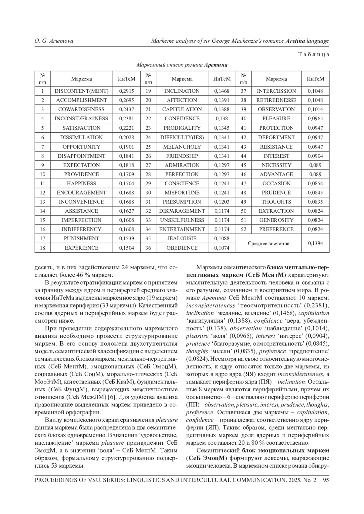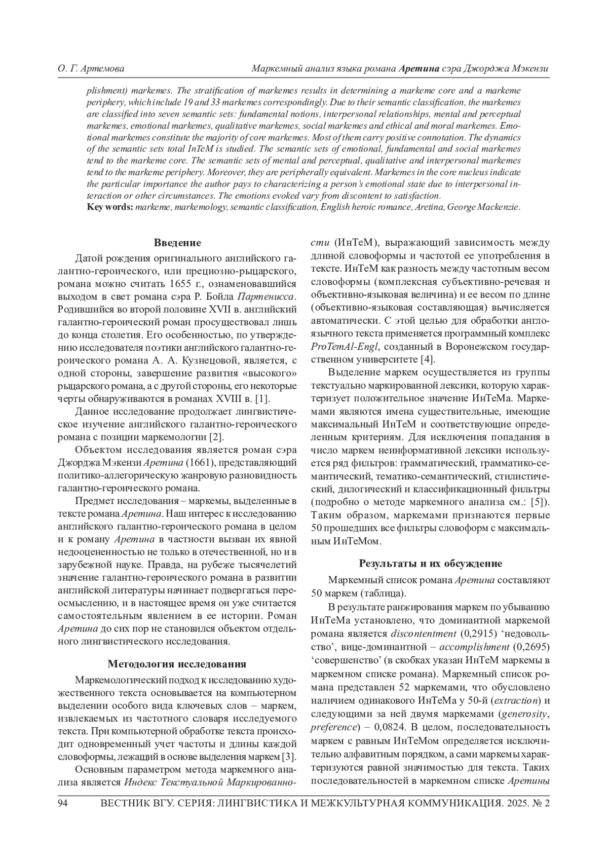 Цель предлагаемой статьи - определение маркемного своеобразия английского галантногероического романа «Аретина» (1661) сэра Джорджа Мэкензи. Предмет исследования составляет анализ маркем, выделенных в тексте романа. Исследование выполнено в русле маркемологии - лингвистического направления, позволяющего на основе выделения особого вида ключевых слов - маркем -осуществить лингвистический анализ текста и выделить доминирующие в нем смыслы. Особенностью данного вида ключевых слов является одновременный учет частоты употребления и информативности каждой лексемы. Средством оценки информативности лексемы служит автоматически вычисляемый Индекс Текстуальной Маркированности (ИнТеМ). Проведенный маркемный анализ языкаромана позволил установить доминантную и вице-доминантную маркемы: discontent(ment) и accomplishment. В результате стратификации маркем установлены маркемное ядро в количестве 19 маркем и маркемная периферия -33 маркемы. В результате семантической классификации маркемы романа «Аретина» распределены в семь семантических блоков: фундаментальные понятия, межличностные маркемы, ментальноперцептивные маркемы, эмоциональные маркемы, качественные маркемы, социальные маркемы, морально-этические маркемы. Среди ядерных маркем доминируют эмоциональные маркемы, большинство из которых характеризуется положительной коннотацией. Установлена динамика суммарного ИнТеМа в маркемном ядре и периферии. К ядру тяготеют семантические блоки эмоциональных, фундаментальных и социальных маркем. Семантические блоки ментально-перцептивных, качественных, межличностных маркем не только тяготеют к периферии, но и являются периферийно-равнозначными. Самым периферийным является семантический блок морально-этических маркем. Маркемы ядра ядра свидетельствуют об особой значимости характеристики эмоционального состояния человека, вызываемого межличностным взаимодействием или внешними обстоятельствами и характеризуемого полярностью вызываемых эмоций - от состояния недовольства до состояния удовлетворенности.