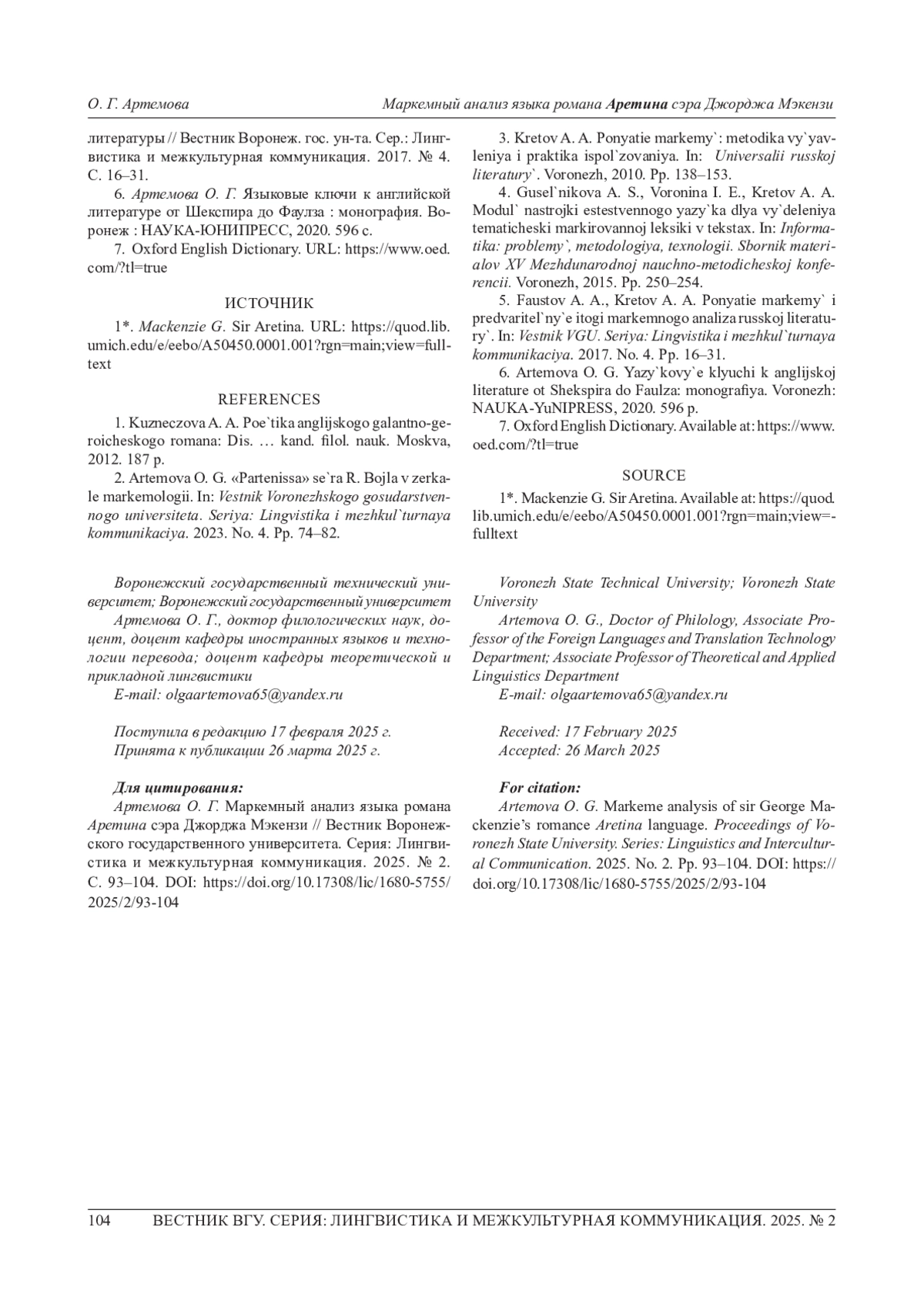 2. 	Артемова О. Г. “Партенисса” сэра Р. Бойла в зеркале маркемологии // Вестник Воронеж. гос. ун-та. Сер.: Лингвистика и межкультурная коммуникация. 2023. № 4. С. 74-82.