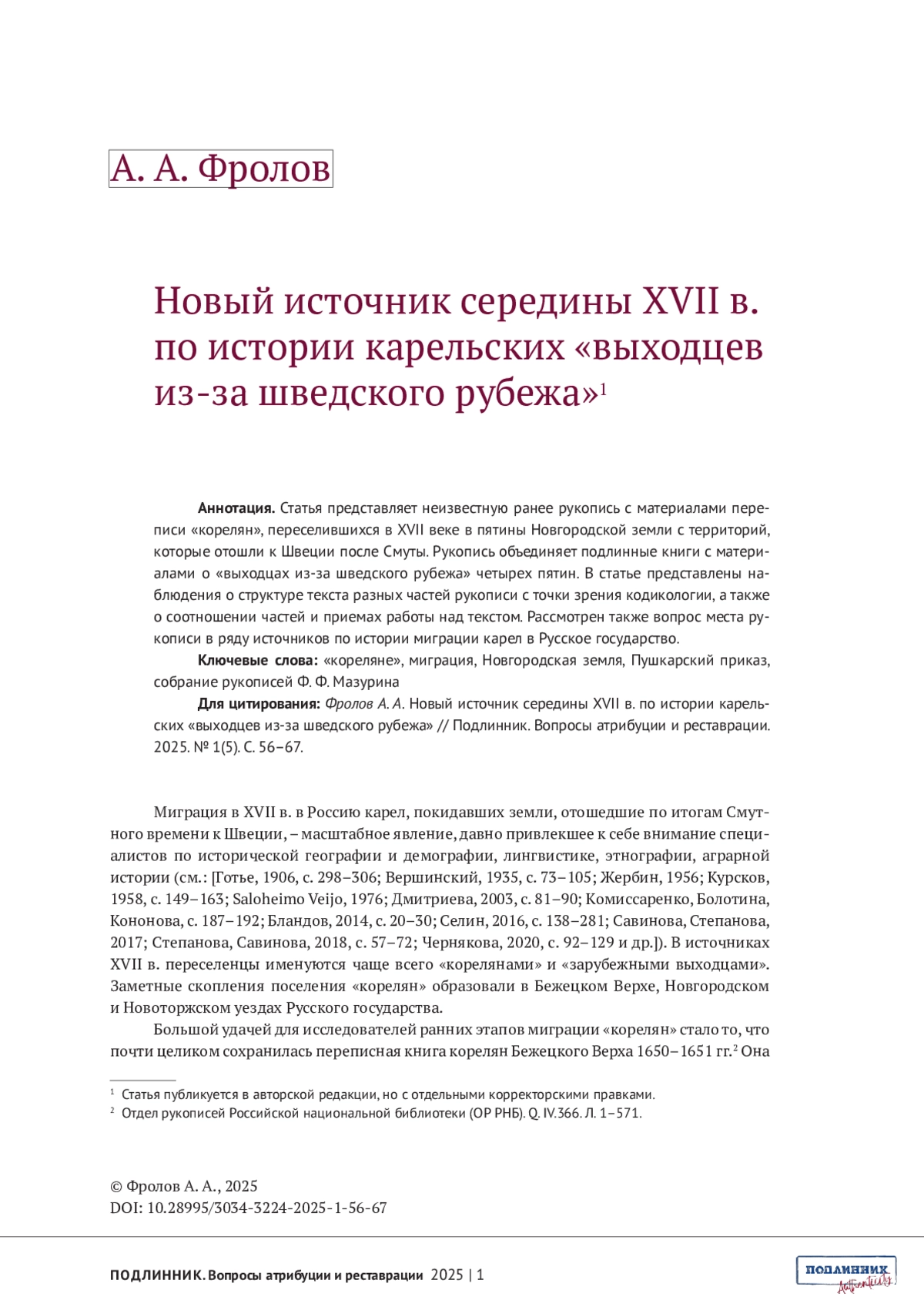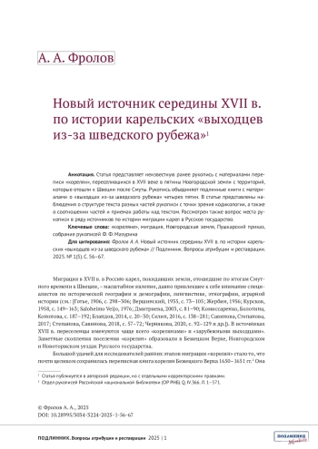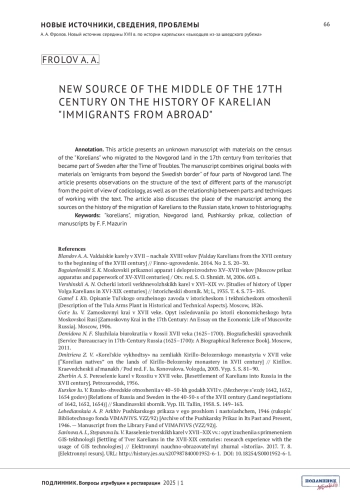 Статья представляет неизвестную ранее рукопись с материалами переписи «корелян», переселившихся в XVII веке в пятины Новгородской земли с территорий, которые отошли к Швеции после Смуты. Рукопись объединяет подлинные книги с материалами о «выходцах из-за шведского рубежа» четырех пятин. В статье представлены наблюдения о структуре текста разных частей рукописи с точки зрения кодикологии, а также о соотношении частей и приемах работы над текстом. Рассмотрен также вопрос места рукописи в ряду источников по истории миграции карел в Русское государство.