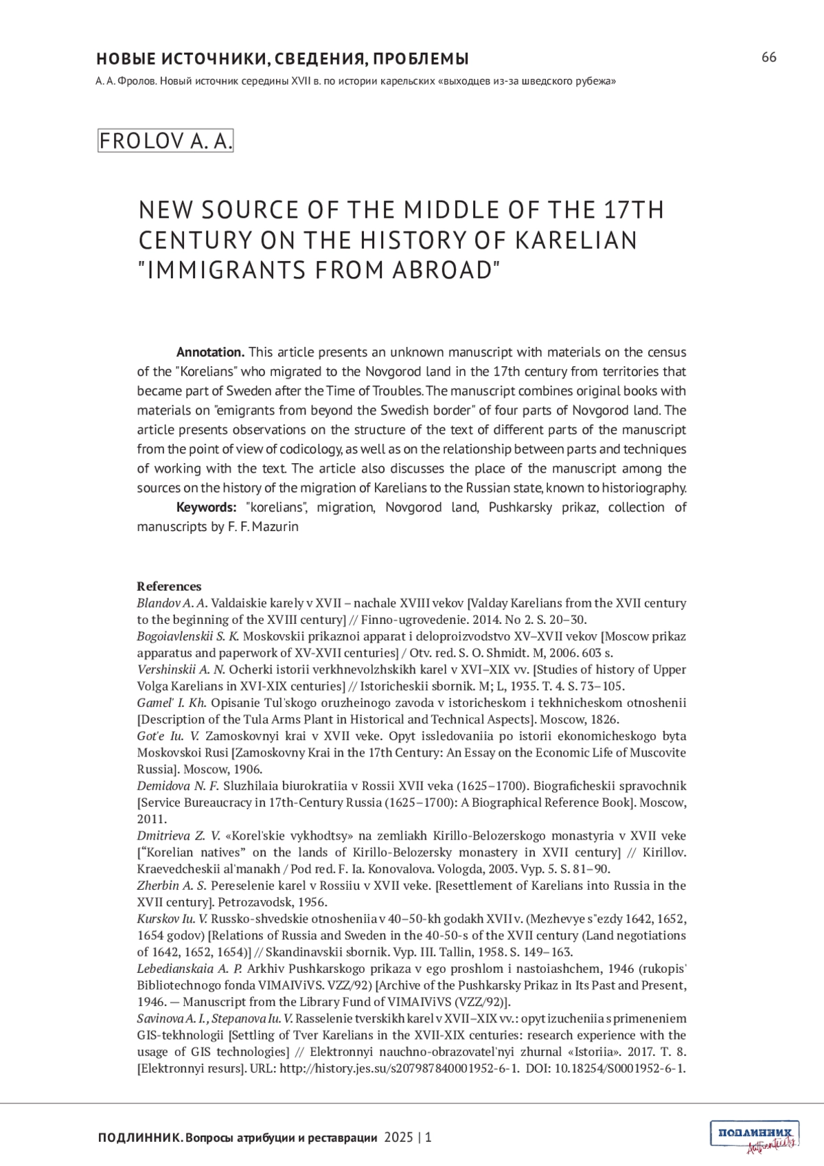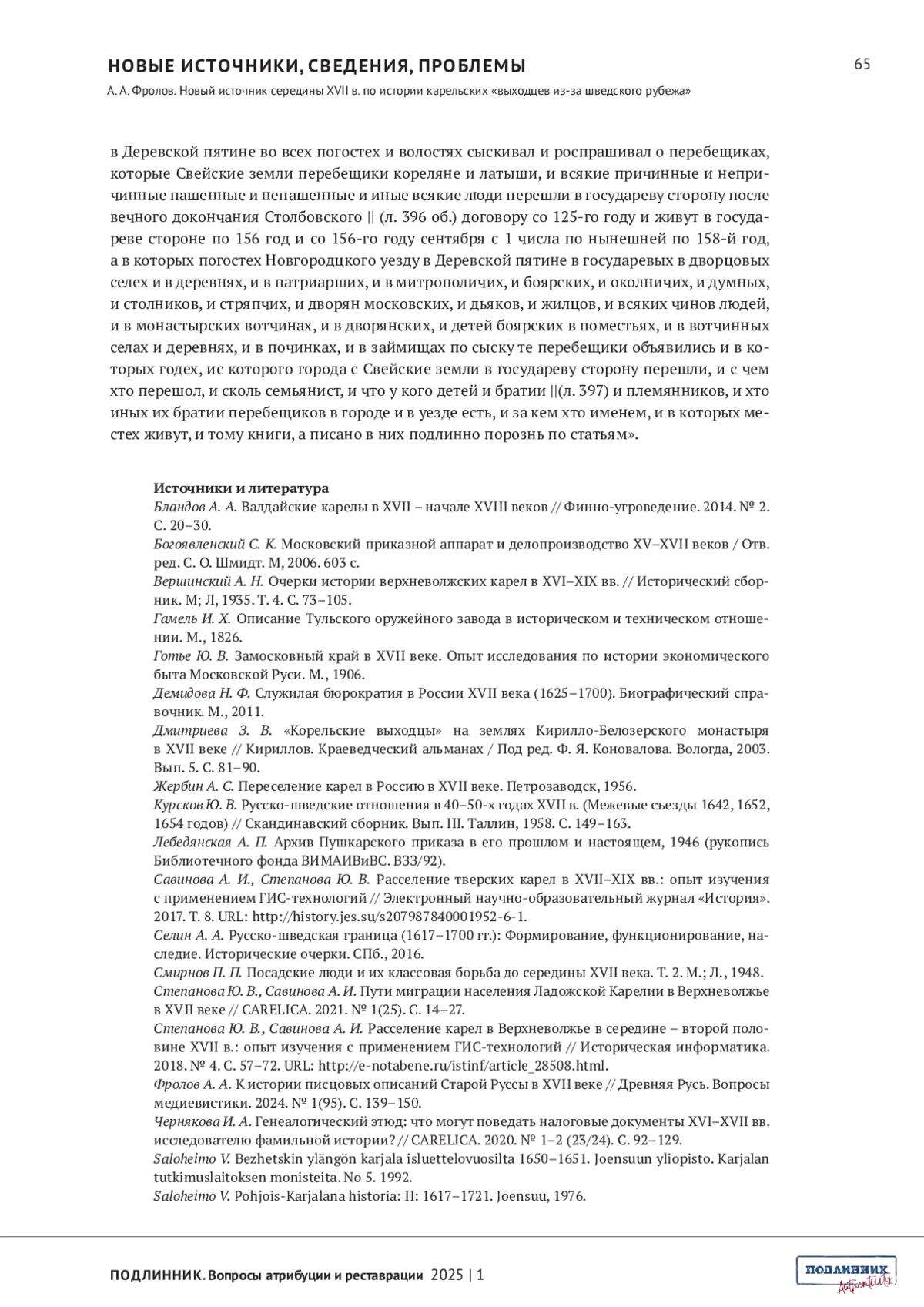 1. Бландов А. А. Валдайские карелы в XVII - начале XVIII веков // Финно-угроведение. 2014. № 2. С. 20-30.