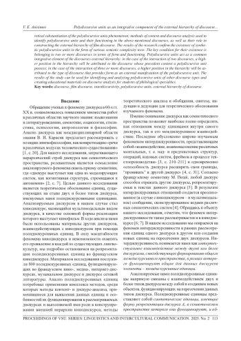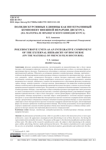 Феномен интердискурсивности, заключающийся во взаимодействии двух и более типов дискурса, обусловливает появление смежных единиц, функционирующих в одном, но имеющих форму репрезентации другого дискурса. Теоретическое обоснование и описание указанных единиц является целью представленной работы. Объектом исследования являются полидискурсивные единицы, предметом -особенности функционирования полидискурсивных единиц в семиотическом пространстве кино-, рекламного, интернет-, медиа-, музыкального дискурсов, а также дискурса социальных сетей. Проведенное исследование полидискурсивных единиц потребовало комплексного анализа с использованием методов теоретического анализа, обобщения и синтеза для теоретического обоснования феномена полидискурсивных единиц; методы контент- и дискурс-анализа, применявшиеся для выявления полидискурсивных единиц и особенностей их функционирования в вышеперечисленных дискурсах, а также их роли в конструировании внешней иерархии кинодискурса. Результаты исследования позволяют выявить синтетические полидискурсивные единицы, существующие в общем интердискурсивном пространстве в виде различных по своей семиотической осложненности текстов, ключевой характеристикой существования которых является принадлежность к двум и более дискурсам с точки зрения формы и функционирования. Полидискурсивные единицы выступают в качестве общего интегративного элемента внешней иерархии дискурсов: в случае взаимодействия двух дискурсов более высокое положение в иерархии будет занимать дискурс, прецедентным содержанием которого обладает полидискурсивная единица; в случае взаимодействия трех и более дискурсов более высокое положение в иерархии займет тип дискурса, обеспечивающий форму как внешнее проявление полидискурсивной единицы. Полученные результаты могут применяться в процессе выявления и анализа полидискурсивных единиц иных типов дискурса и создании учебных материалов по дискурс-анализу для студентов филологических специальностей.