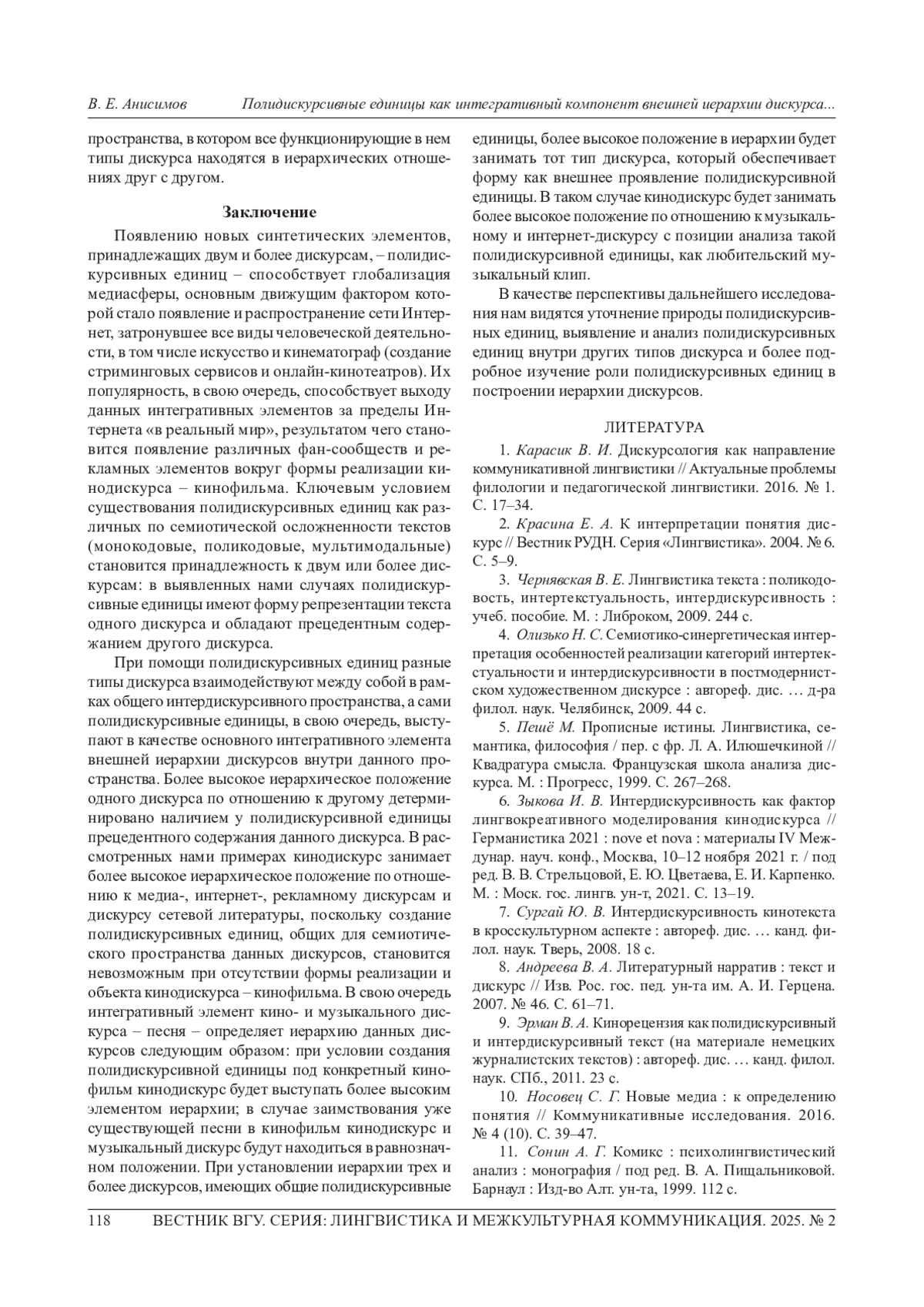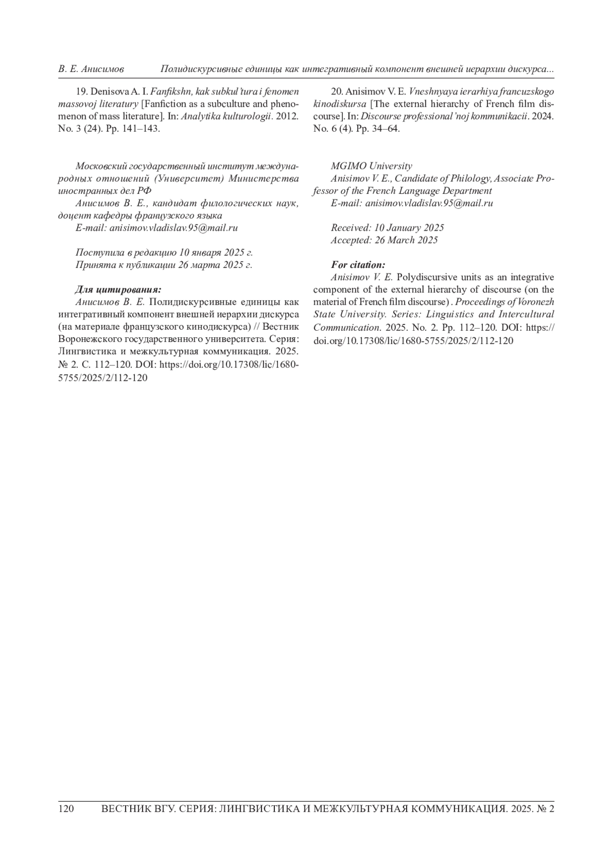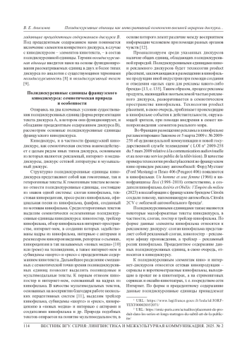 20. Анисимов В. Е. Внешняя иерархия французского кинодискурса // Дискурс профессиональной коммуникации. 2024. № 6 (4). С. 34-64. EDN: BMPNXA