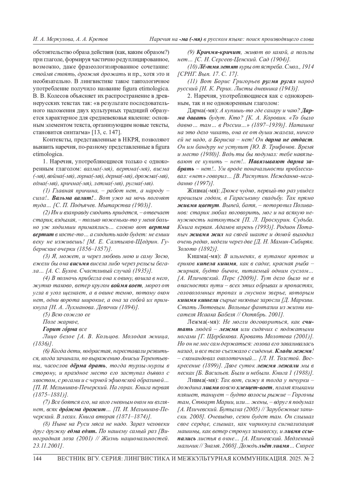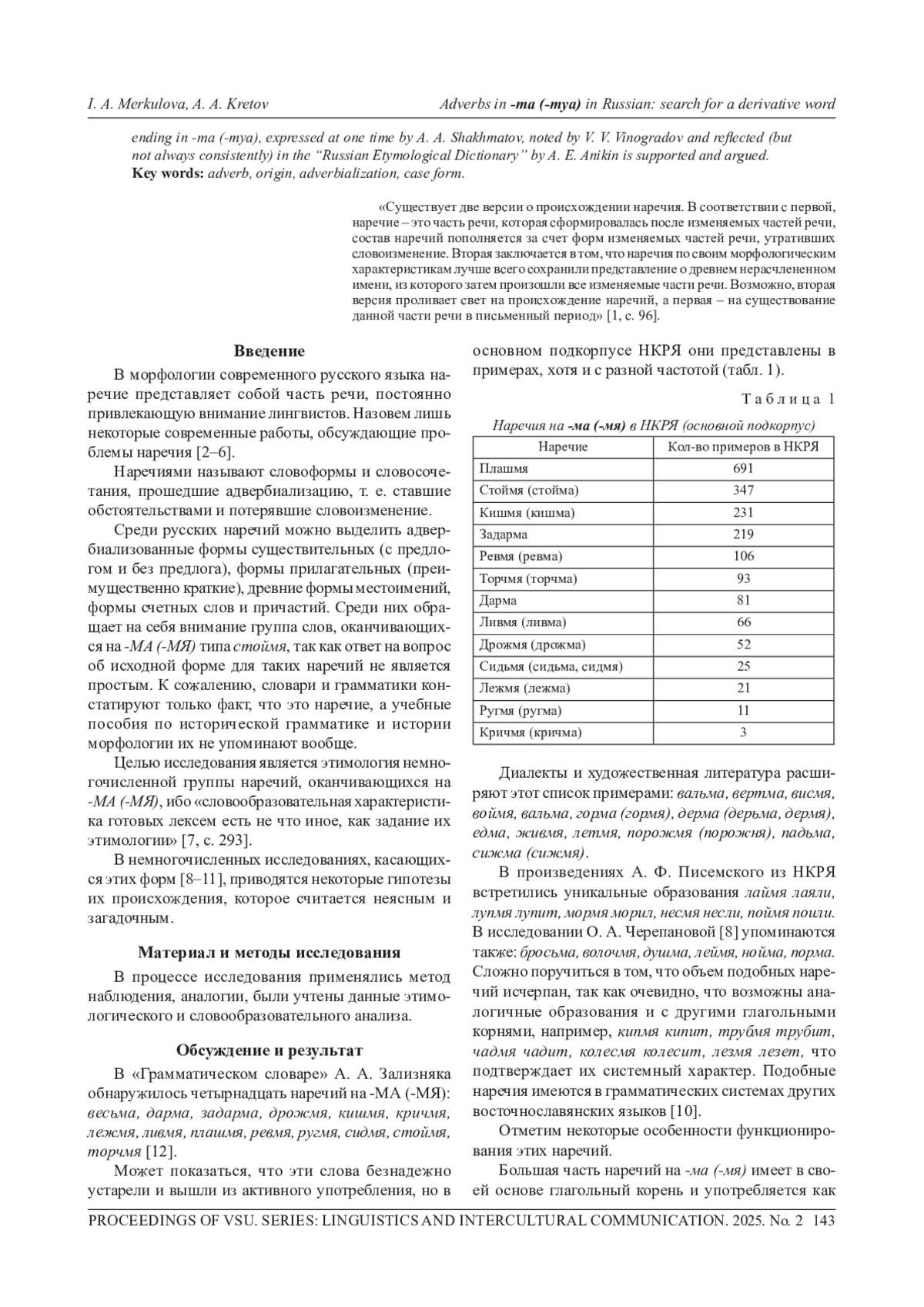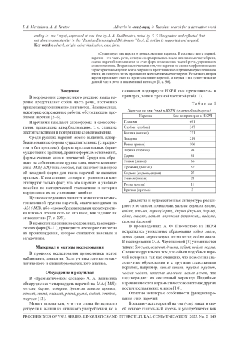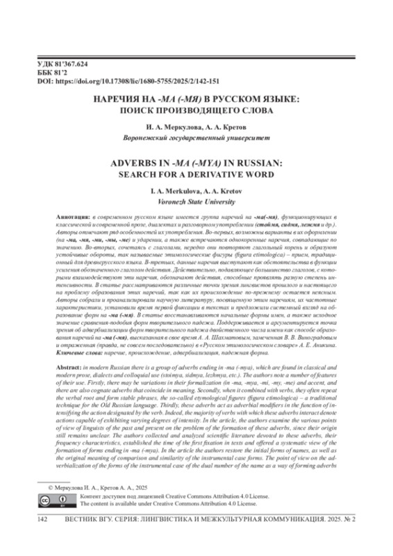 В современном русском языке имеется группа наречий на -ма(-мя), функционирующих в классической и современной прозе, диалектах и разговорном употреблении (стоймя, сидмя, лежмя и др.). Авторы отмечают ряд особенностей их употребления. Во-первых, возможны варианты в их оформлении (на -ма, -мя, -ми, -мы, -ме) и ударении, а также встречаются однокоренные наречия, совпадающие по значению. Во-вторых, сочетаясь с глаголами, нередко они повторяют глагольный корень и образуют устойчивые обороты, так называемые этимологические фигуры (figura etimologica) - прием, традиционный для древнерусского языка. В-третьих, данные наречия выступают как обстоятельства в функции усиления обозначенного глаголом действия. Действительно, подавляющее большинство глаголов, с которыми взаимодействуют эти наречия, обозначают действия, способные проявлять разную степень интенсивности. В статье рассматриваются различные точки зрения лингвистов прошлого и настоящего на проблему образования этих наречий, так как их происхождение по-прежнему остается неясным. Авторы собрали и проанализировали научную литературу, посвященную этим наречиям, их частотные характеристики, установили время первой фиксации в текстах и предложили системный взгляд на образование форм на -ма (-мя). В статье восстанавливаются начальные формы имен, а также исходное значение сравнения-подобия форм творительного падежа. Поддерживается и аргументируется точка зрения об адвербиализации форм творительного падежа двойственного числа имени как способе образования наречий на -ма (-мя), высказанная в свое время А. А. Шахматовым, замеченная В. В. Виноградовым и отраженная (правда, не совсем последовательно) в «Русском этимологическом словаре» А. Е. Аникина