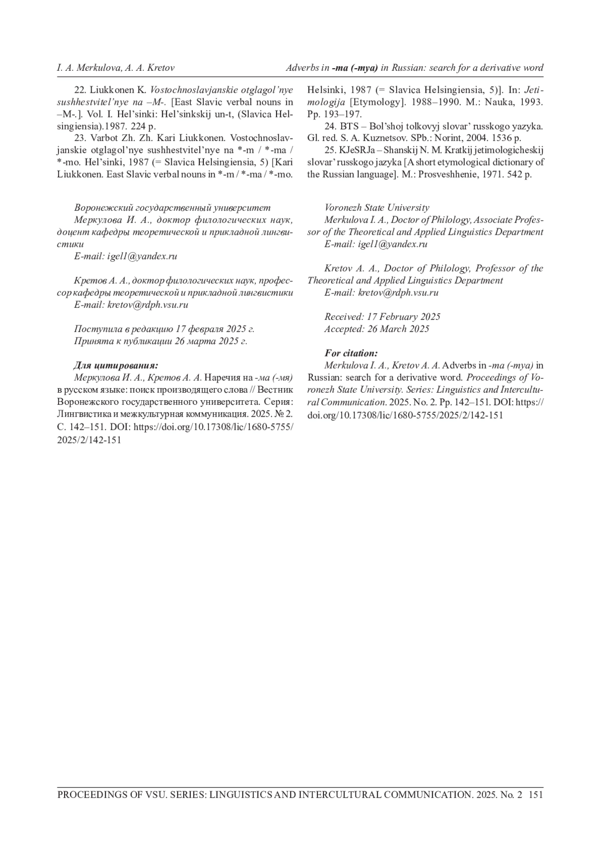 22. Лиукконен К. Восточнославянские отглагольные существительные на - М-. Том I. Хельсинки: Хельсинкский ун-т, 1987. 224 с. (Slavica Helsingiensia).