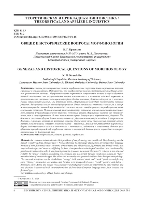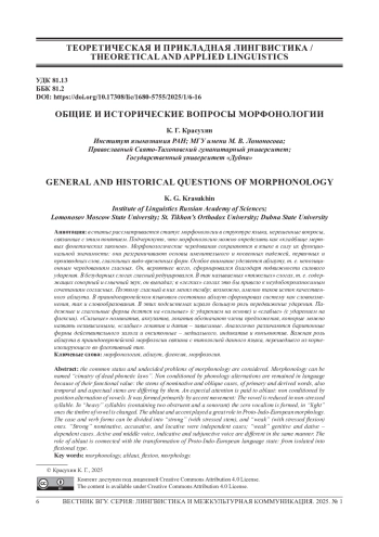 В статье рассматривается статус морфонологии в структуре языка, нерешенные вопросы, связанные с этим понятием. Подчеркнуто, что морфонологию можно определить как «кладбище мертвых фонетических законов». Морфонологические чередования сохраняются в языке в силу их функциональной значимости: они разграничивают основы именительного и косвенных падежей, первичных и производных слов, глагольных видо-временных форм. Особое внимание уделяется аблауту, т. е. непозиционным чередованиям гласных. Он, вероятнее всего, сформировался благодаря подвижности силового ударения. В безударных слогах гласный редуцировался. В так называемых «тяжелых» слогах, т. е. содержащих сонорный и смычный звук, он выпадал; в «легких» слогах это бы привело к неудобопроизносимым сочетаниям согласных. Поэтому гласный в них менял тембр; возможно, именно таков исток качественного аблаута. В праиндоевропейском языковом состоянии аблаут сформировал систему как словоизменения, так и словообразования. В этих подсистемах играло большую роль передвижение ударения. Падежные и глагольные формы делятся на «сильные» (с ударением на основе) и «слабые» (с ударением на флексии). «Сильные» номинатив, аккузатив, локатив обозначают члены предложения, которые можно назвать независимыми, «слабые» генитив и датив - зависимые. Аналогично различаются баритонные формы действительного залога и окситонные - медиального, индикатив и конъюнктив. Важная роль аблаута в праиндоевропейской морфологии связана с типологией данного языка, перешедшего из корнеизолирующего во флективный тип.
