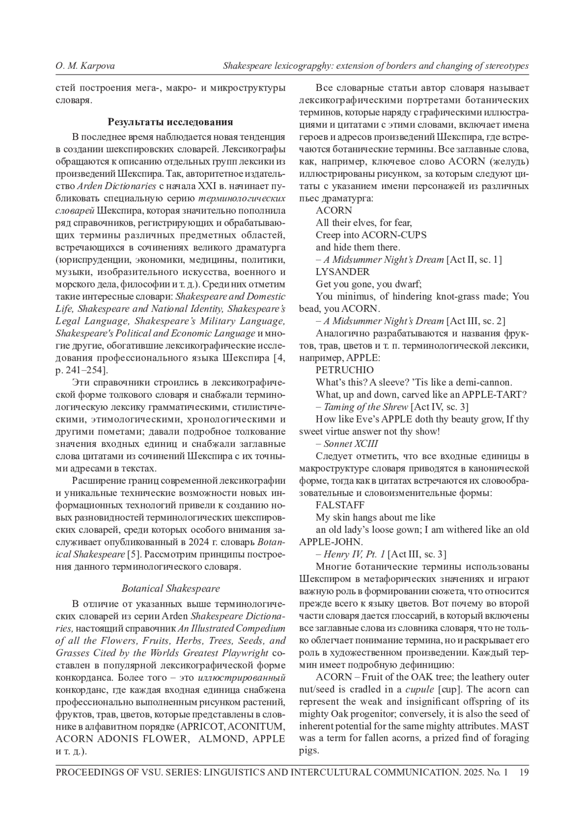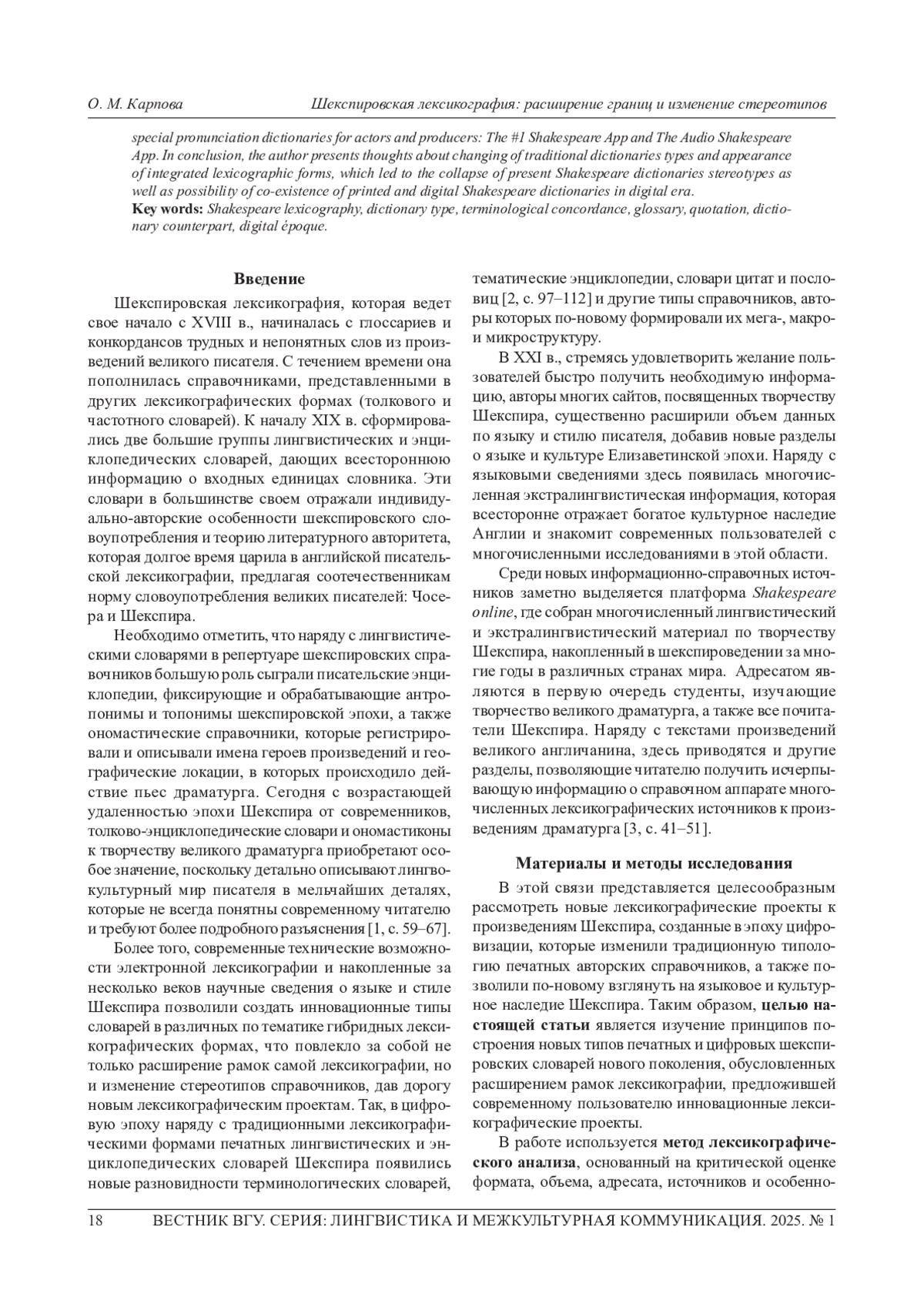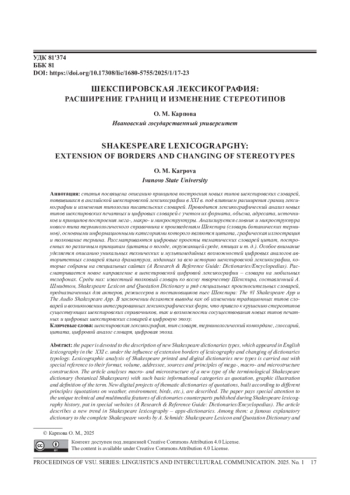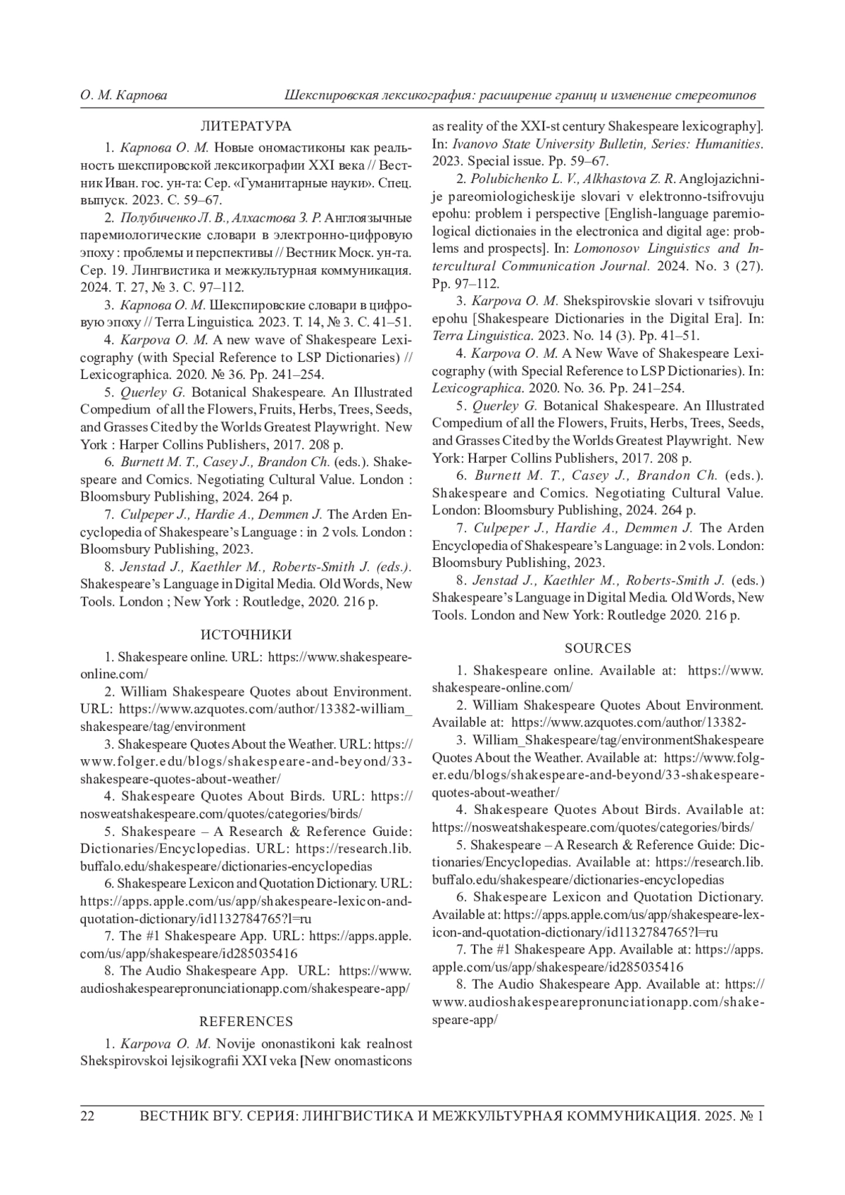 4. 	Karpova О. М. A new wave of Shakespeare Lexicography (with Special Reference to LSP Dictionaries) // Lexicographica. 2020. № 36. Рр. 241-254. EDN: KHMZIF