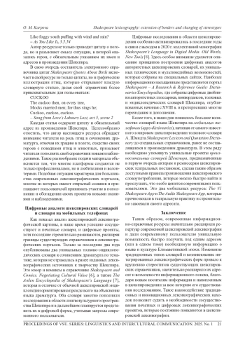 3. 	Карпова О. М. Шекспировские словари в цифровую эпоху //TerraLinguistica. 2023. Т. 14, № 3. С. 41-51.