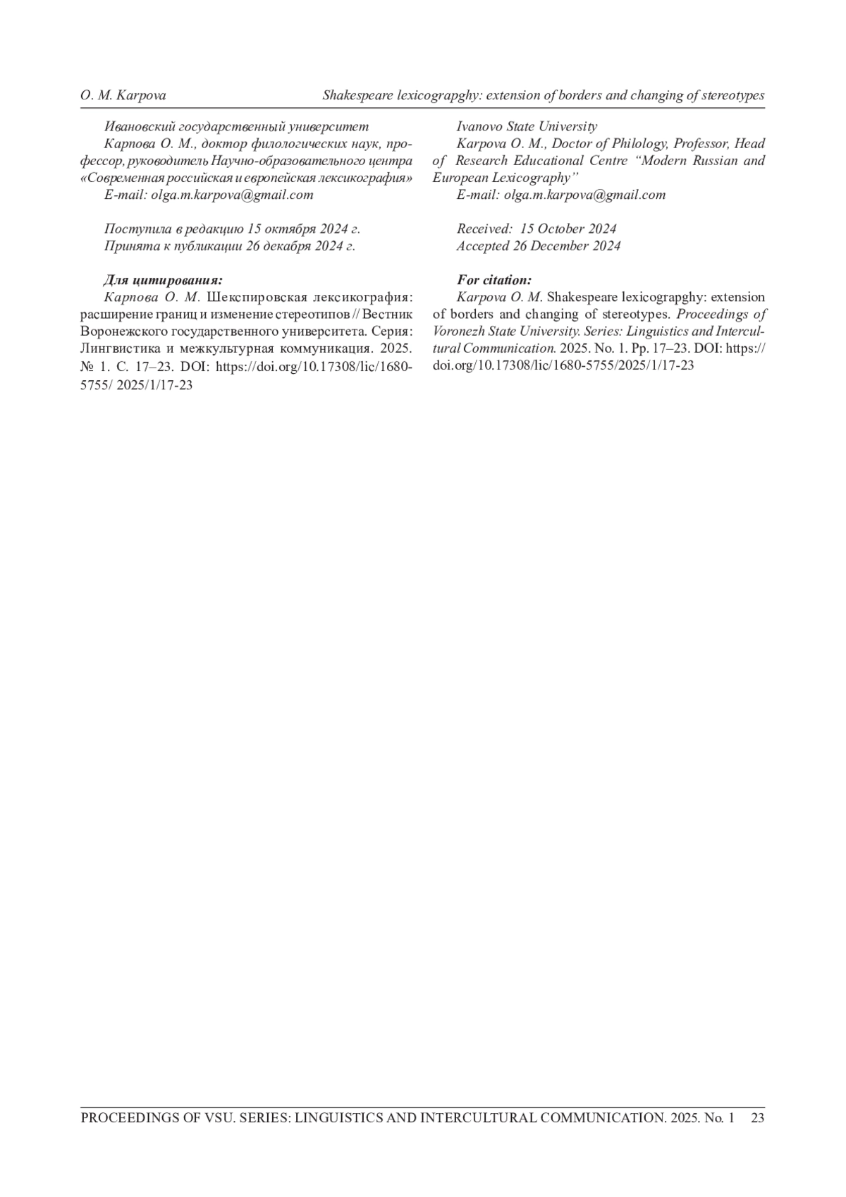 1. 	Карпова О. М. Новые ономастиконы как реальность шекспировской лексикографии XXI века // Вестник Иван. гос. ун-та: Сер. “Гуманитарные науки”. Спец. выпуск. 2023. С. 59-67.