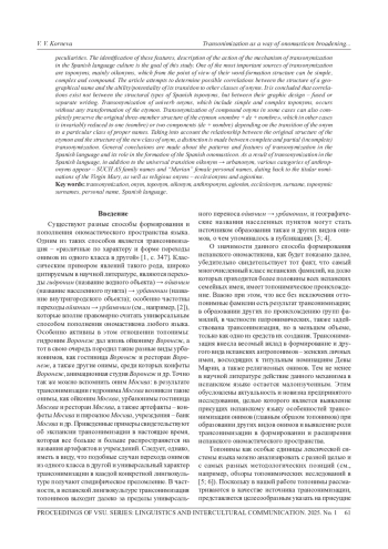 Статья посвящена проблеме образования онимов в испанском языке, источником которых является трансонимизация. Классическим случаем трансонимизации являются переходы «гидроним → ойконим→ урбаноним», которые относятся к универсальным средствам расширения ономастического пространства любого языка. Однако в каждой лингвокультуре наряду с общими закономерностями перехода онимов из одного класса в другой существуют свои особенности. Выявление этих особенностей, описание действия механизма трансонимизации в испанской лингвокультуре является целью настоящего исследования. Одним из важнейших источников трансонимизации являются топонимы, главным образом ойконимы, которые с точки зрения их словообразовательной структуры бывают простыми, сложными и составными. В статье предпринимается попытка определить возможные корреляции между структурой географического названия и способностью/потенциальностью его перехода в другие классы онимов. Делаются выводы о том, что корреляции существуют не между структурными типами испанских топонимов, а между их графическим оформлением  слитным или раздельным написанием. Трансонимизация онимов-универбов, к которым относятся простые и сложные топонимы, происходит без какой-либо трансформации этимона. Трансонимизация составных онимов в одних случаях также может полностью сохранять исходную трехчленную структуру этимона «nombre + de + nombre», которая в других случаях неизменно сокращается до одного (nombre) или двух компонентов (de + nombre) в зависимости от перехода онима в тот или иной класс имен собственных. С учетом соотношения исходной структуры этимона и структуры нового класса онима различаются полная и частичная (неполная) трансонимизация. Делаются общие выводы о закономерностях и особенностях трансонимизации в испанском языке и о ее роли в формировании испанского ономастикона. В результате трансонимизации в испанском языке кроме универсального перехода ойконим → урбаноним появляются разные разряды антропонимов фамильные имена и «марианские» женские личные имена, восходящие к титульным номинациям Девы Марии, а также религиозные онимы экклезионимы и агионимы.