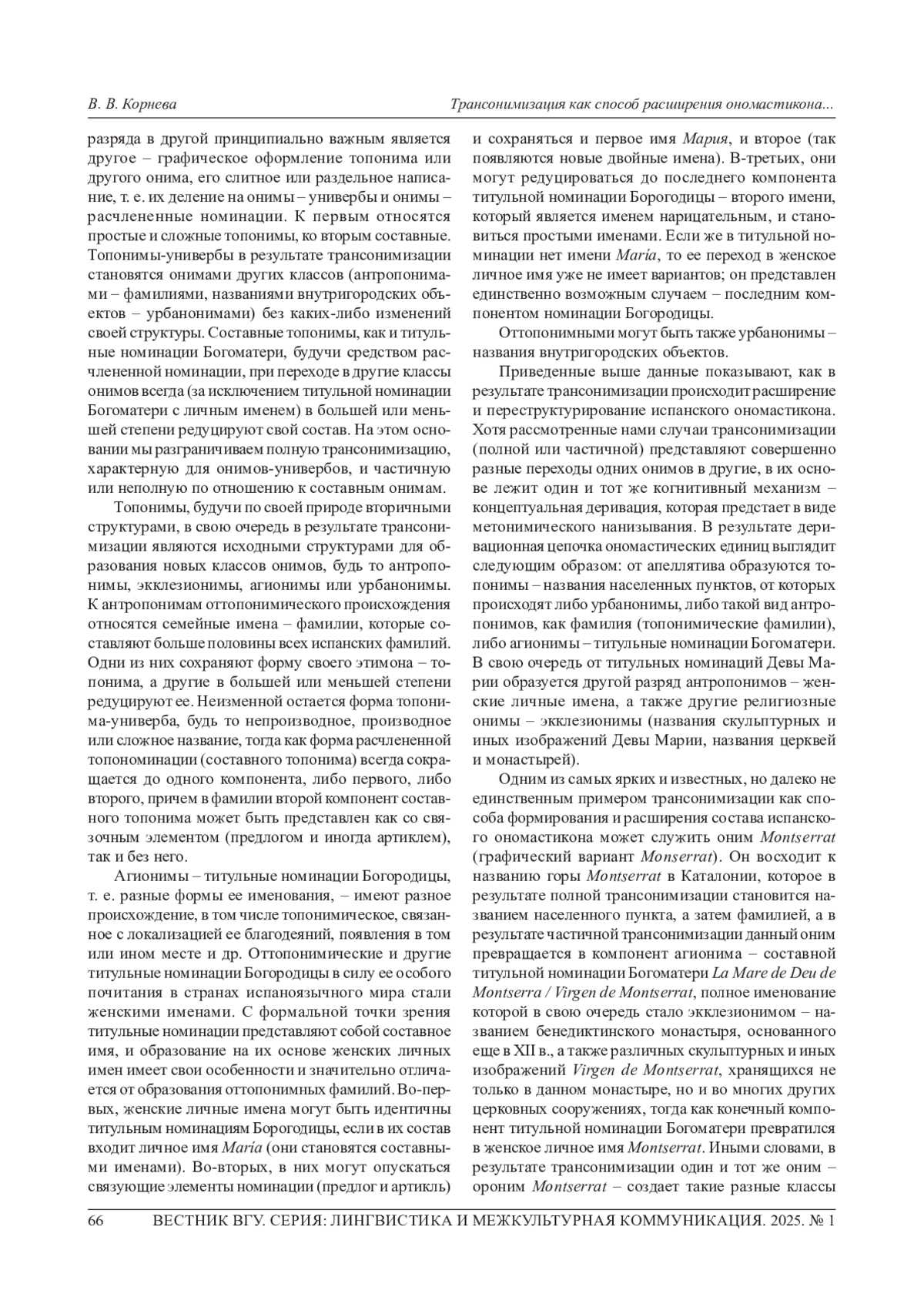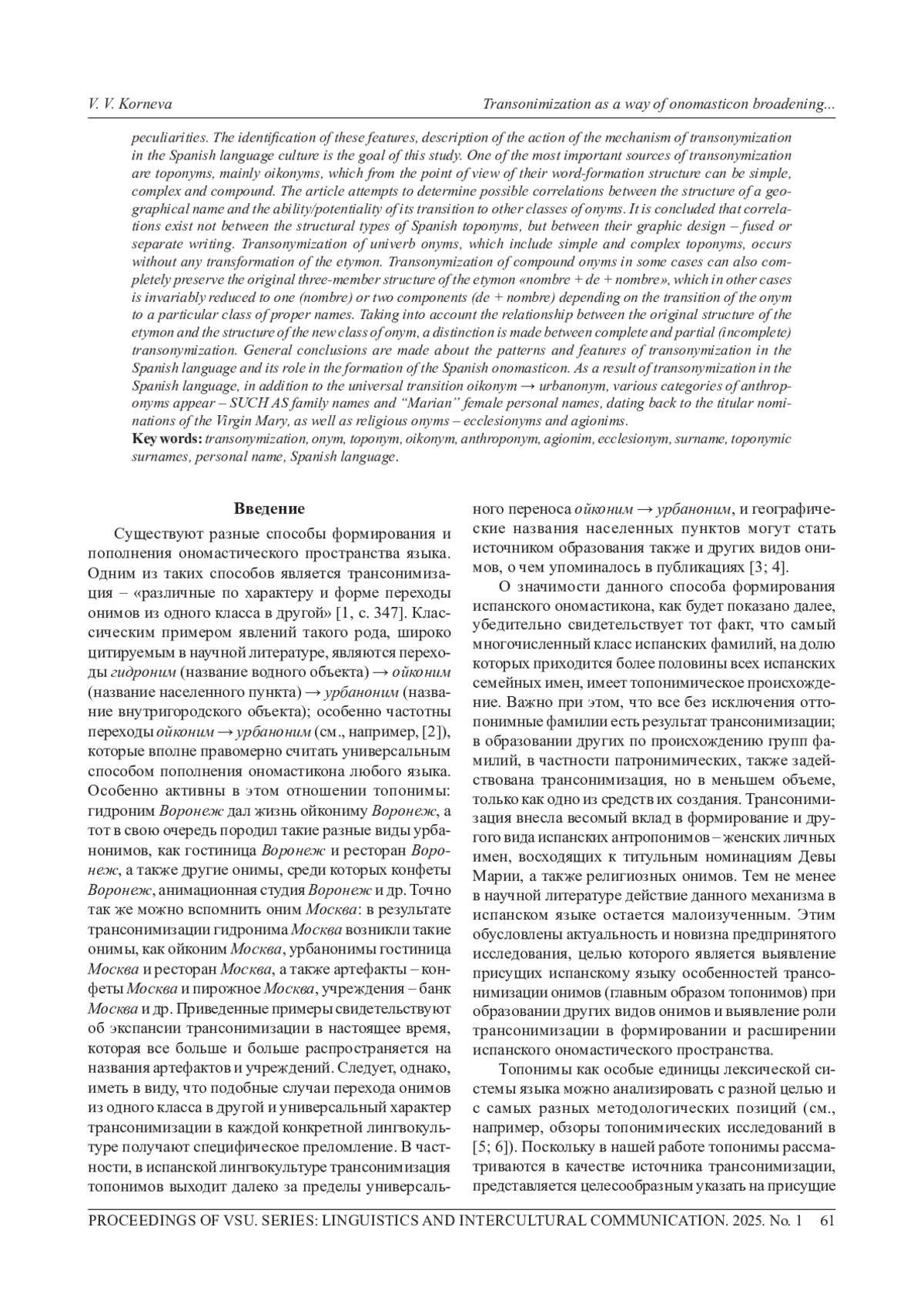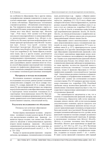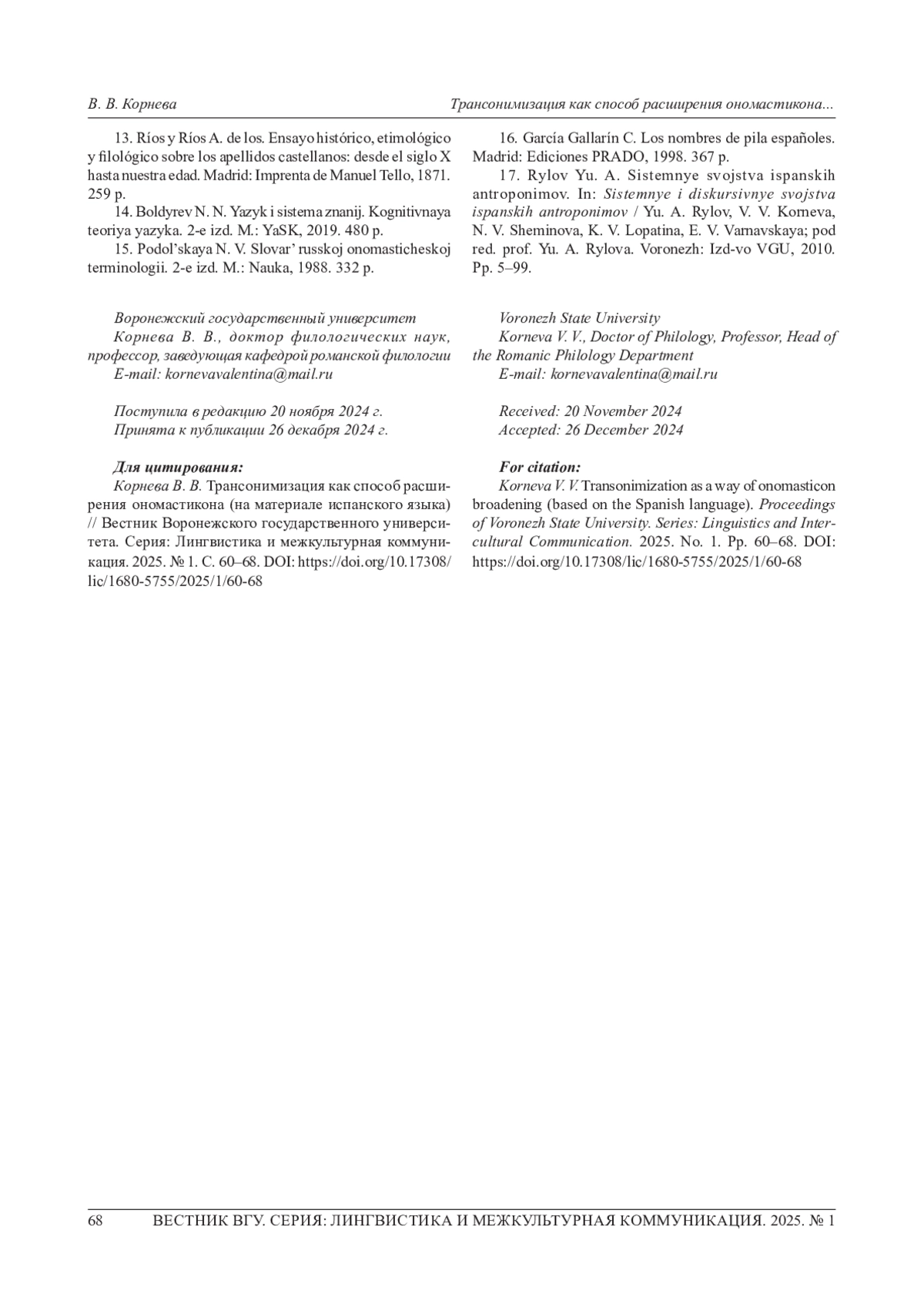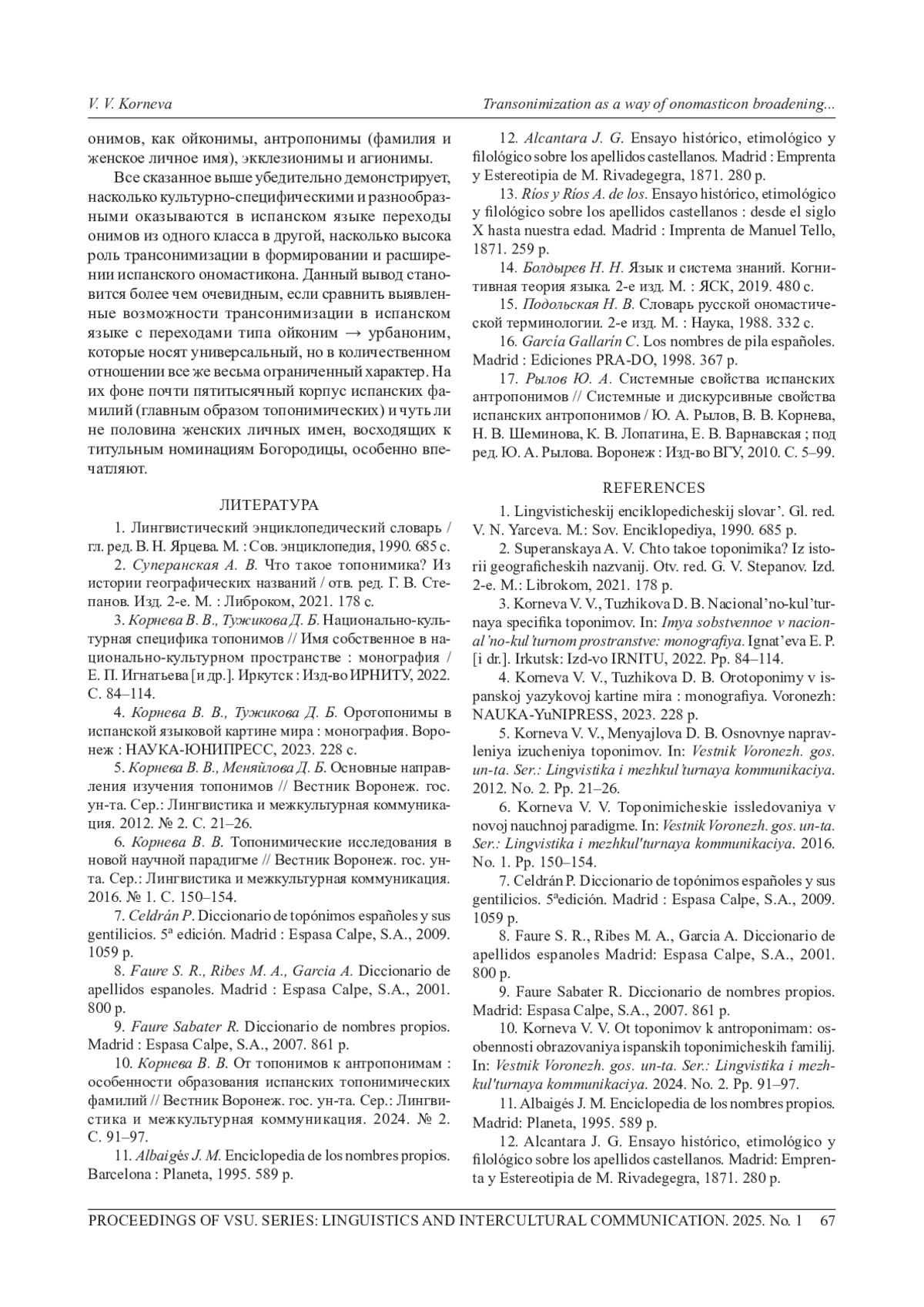 10. 	Корнева В. В. От топонимов к антропонимам: особенности образования испанских топонимических фамилий // Вестник Воронеж, гос. ун-та. Сер.: Лингвистика и межкультурная коммуникация. 2024. № 2. С. 91-97.