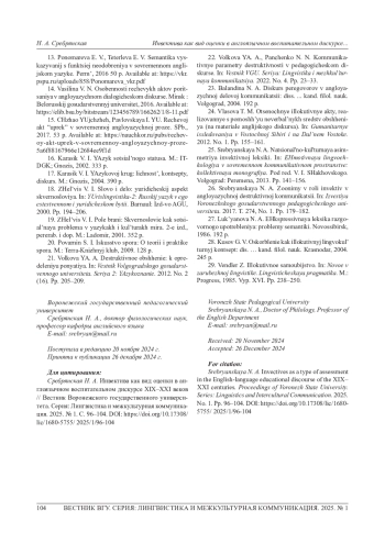26. 	Сребрянская Н. А. Зоонимы в роли инвектив в англоязычной деструктивной коммуникации // Изв. Воронеж, гос. пед. ун-та. 2017. Т. 274, № 1. С. 179-182.