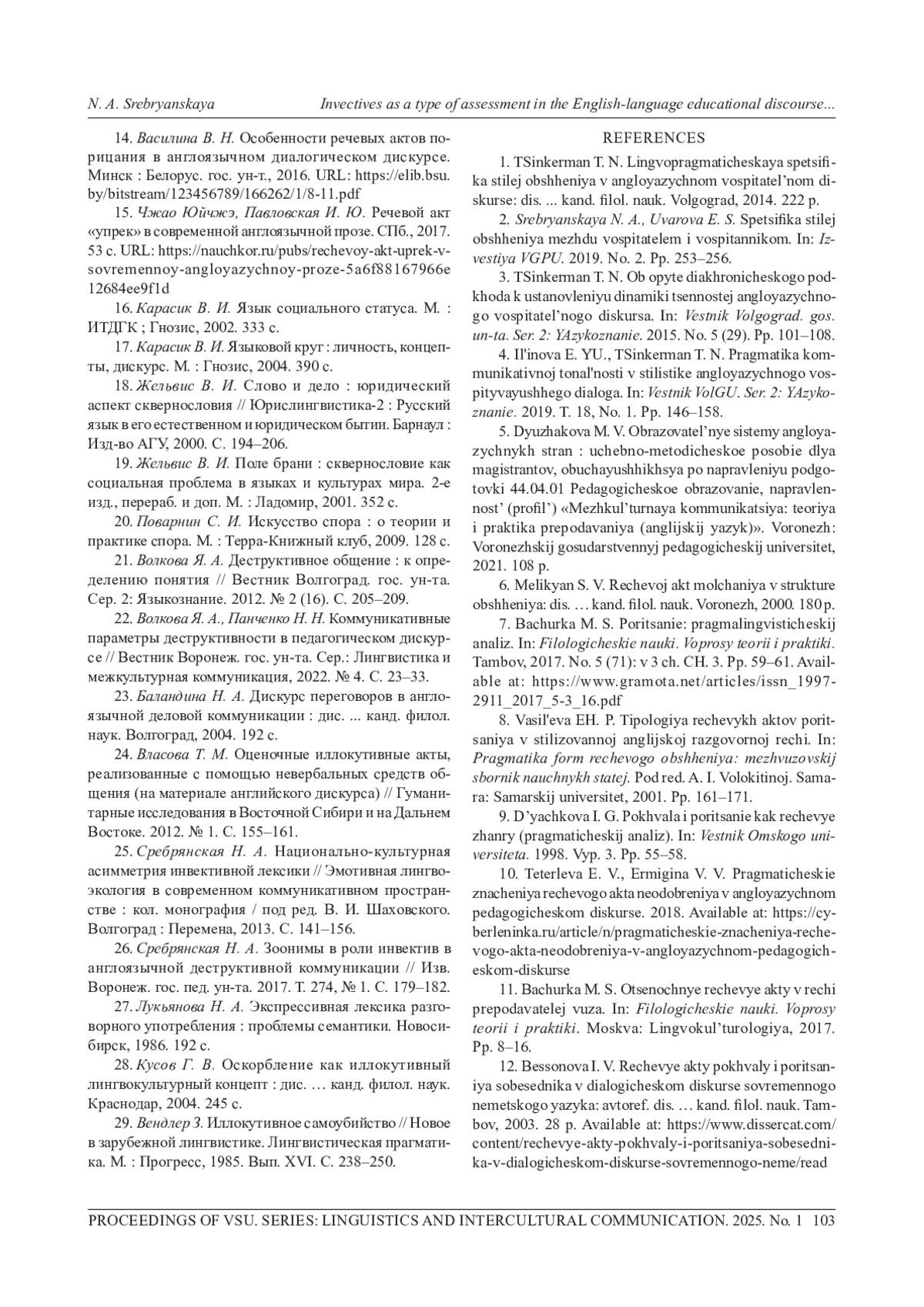 8. 	Васильева Э. П. Типология речевых актов порицания в стилизованной английской разговорной речи // Прагматика форм речевого общения: межвуз. сб. науч. ст. / под ред. А. И. Волокитиной. Самара: Самарский университет, 2001. С. 161-171. EDN: YHNBMR