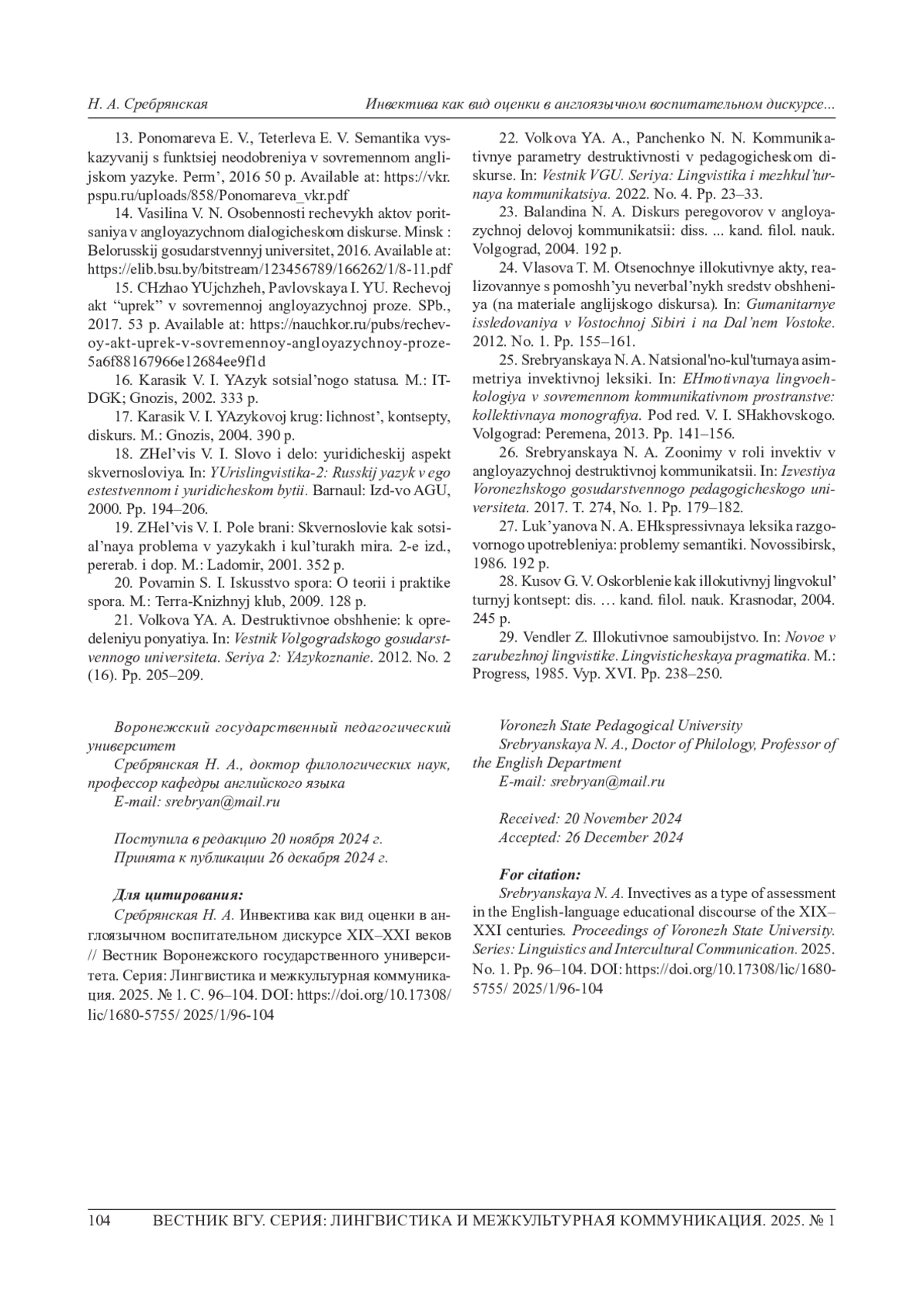 25. 	Сребрянская Н. А. Национально-культурная асимметрия инвективной лексики // Эмотивная лингвоэкология в современном коммуникативном пространстве: кол. монография / под ред. В. И. Шаховского. Волгоград: Перемена, 2013. С. 141-156.