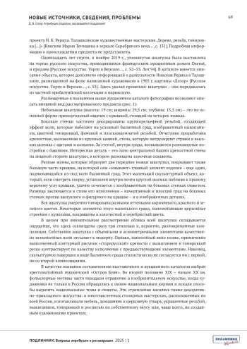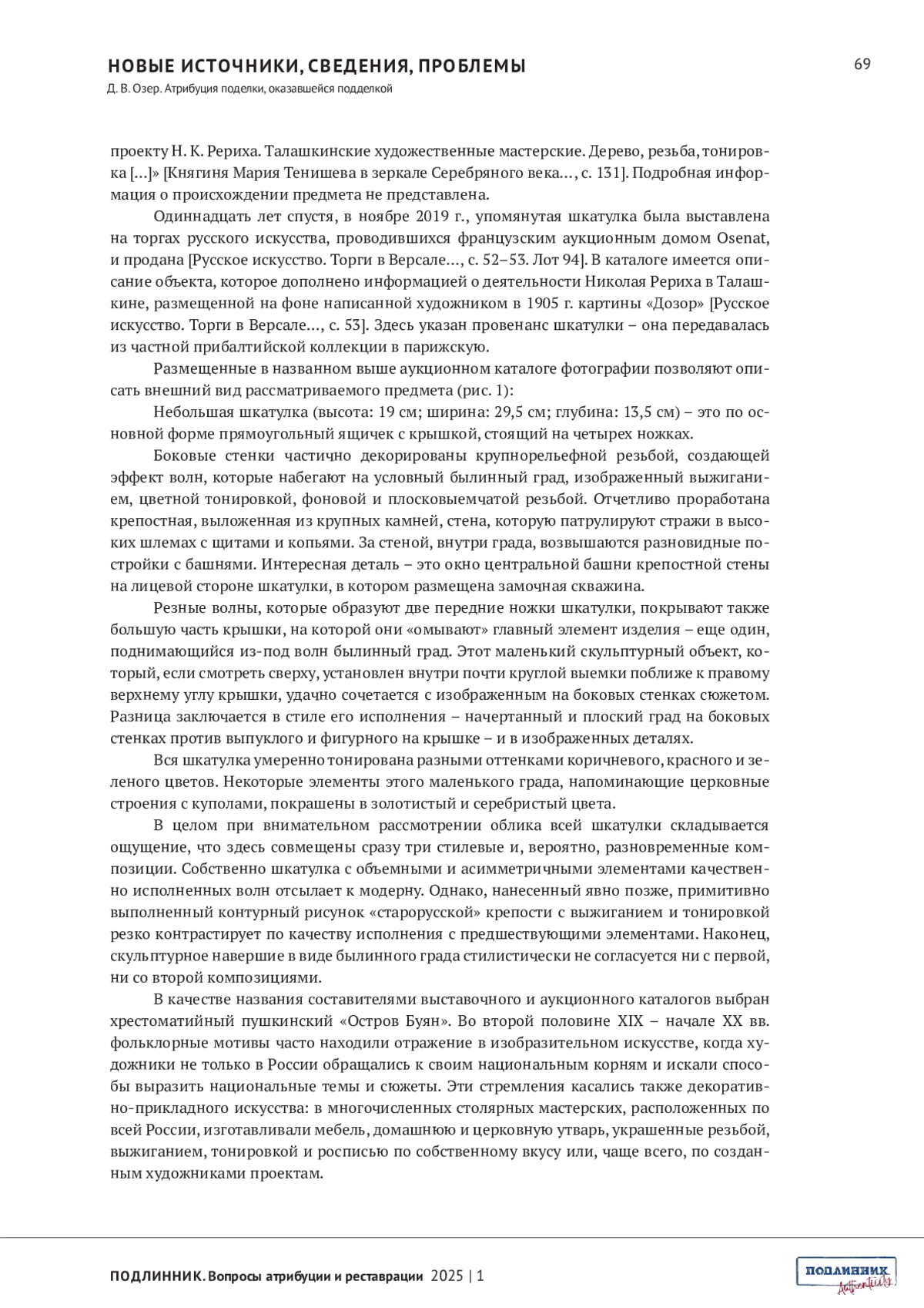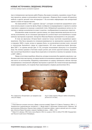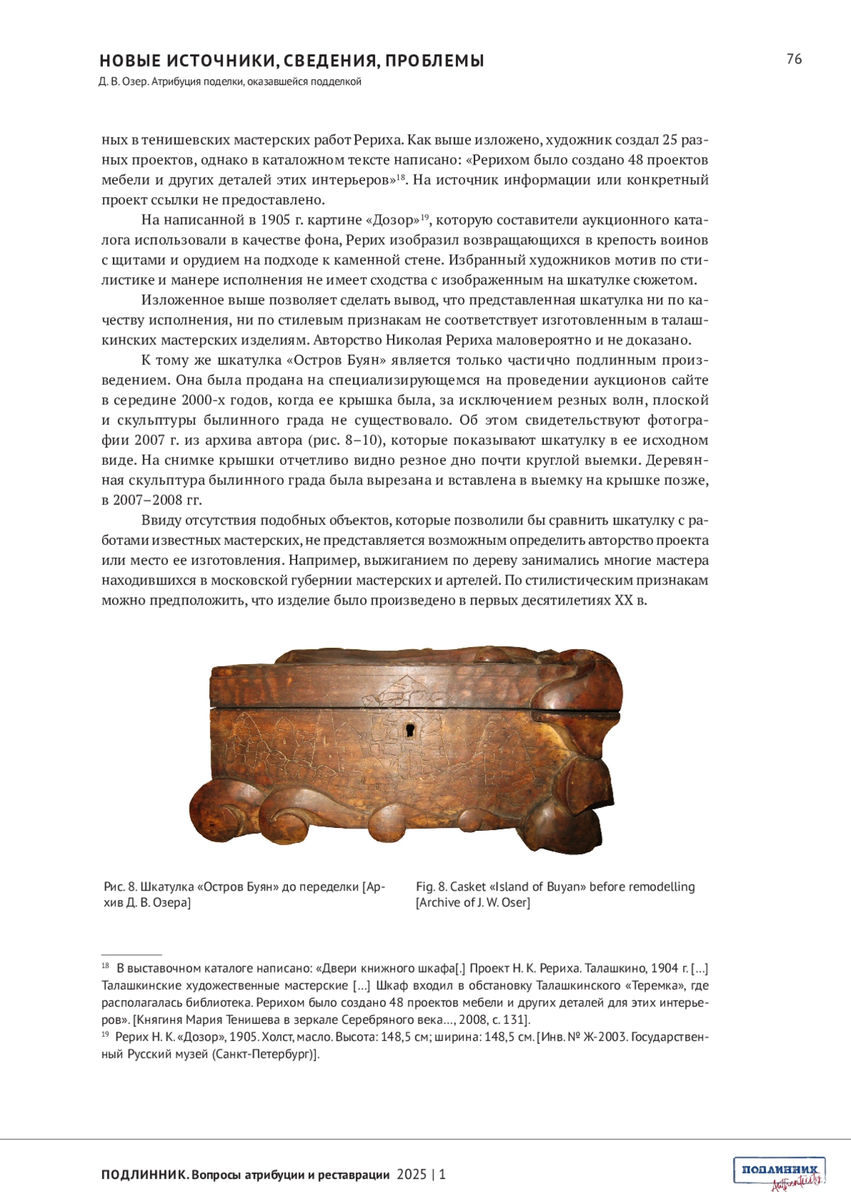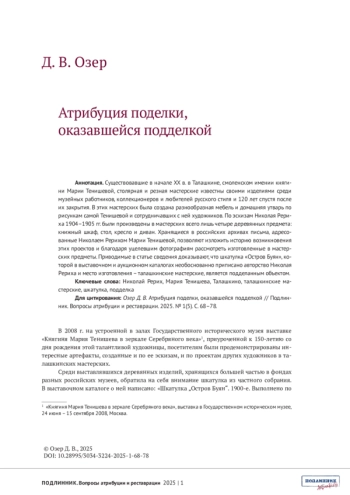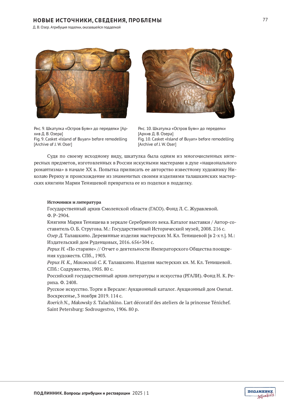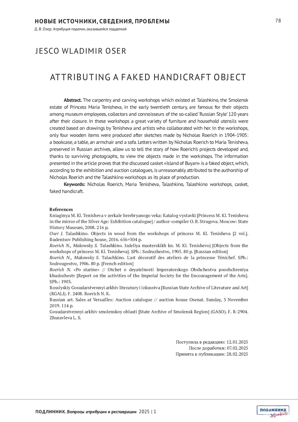 Существовавшие в начале ХХ в. в Талашкине, смоленском имении княгини Марии Тенишевой, столярная и резная мастерские известны своими изделиями среди музейных работников, коллекционеров и любителей русского стиля и 120 лет спустя после их закрытия. В этих мастерских была создана разнообразная мебель и домашняя утварь по рисункам самой Тенишевой и сотрудничавших с ней художников. По эскизам Николая Рериха 1904-1905 гг. были произведены в мастерских всего лишь четыре деревянных предмета: книжный шкаф, стол, кресло и диван. Хранящиеся в российских архивах письма, адресованные Николаем Рерихом Марии Тенишевой, позволяют изложить историю возникновения этих проектов и благодаря уцелевшим фотографиям рассмотреть изготовленные в мастерских предметы. Приводимые в статье сведения доказывают, что шкатулка «Остров Буян», которой в выставочном и аукционном каталогах необоснованно приписано авторство Николая Рериха и место изготовления - талашкинские мастерские, является подделанным объектом.