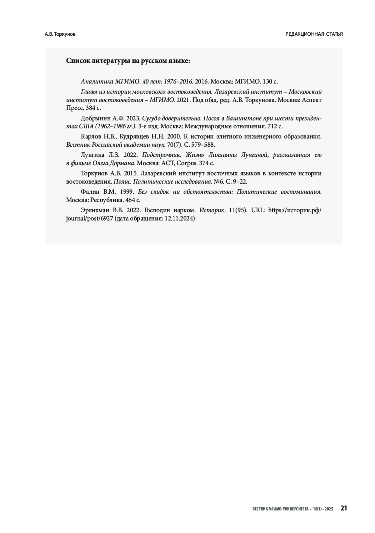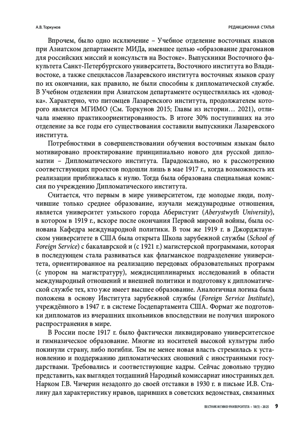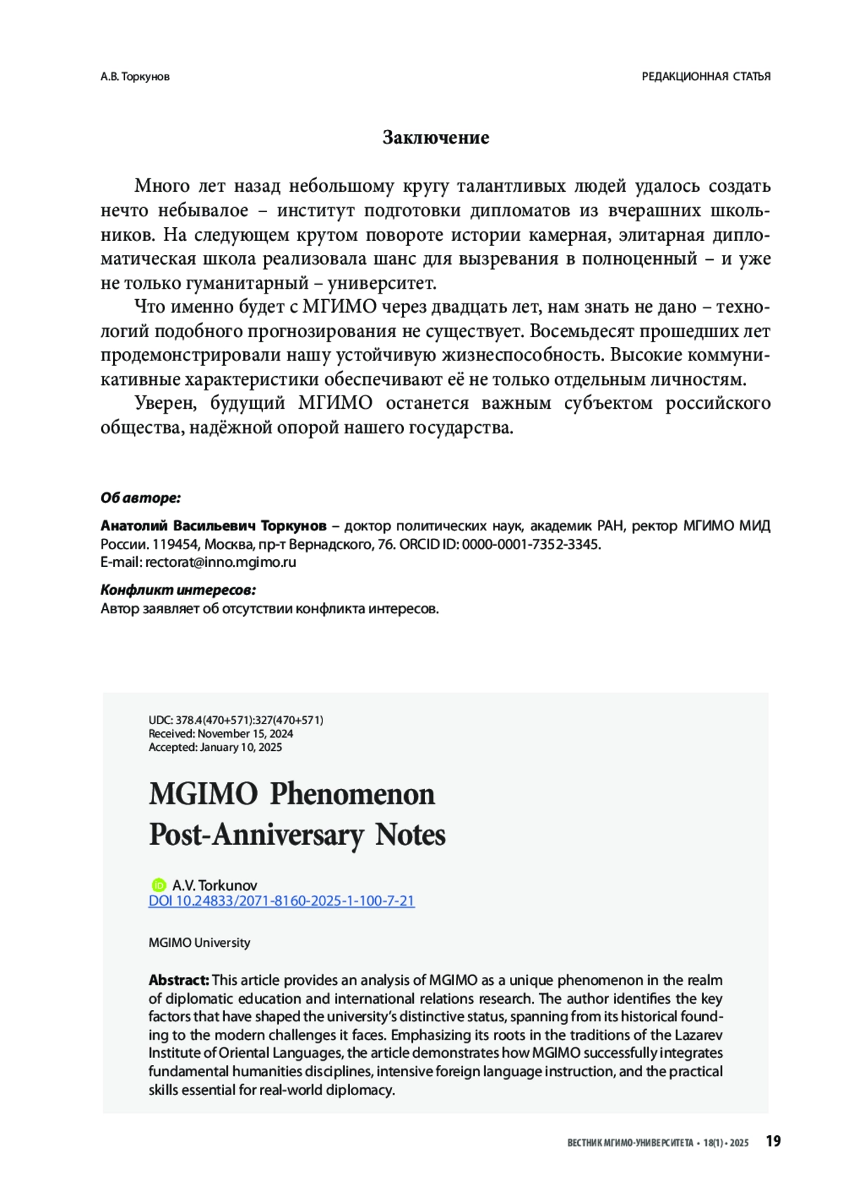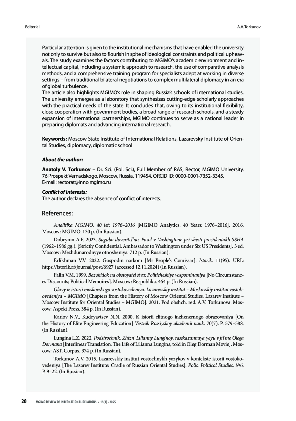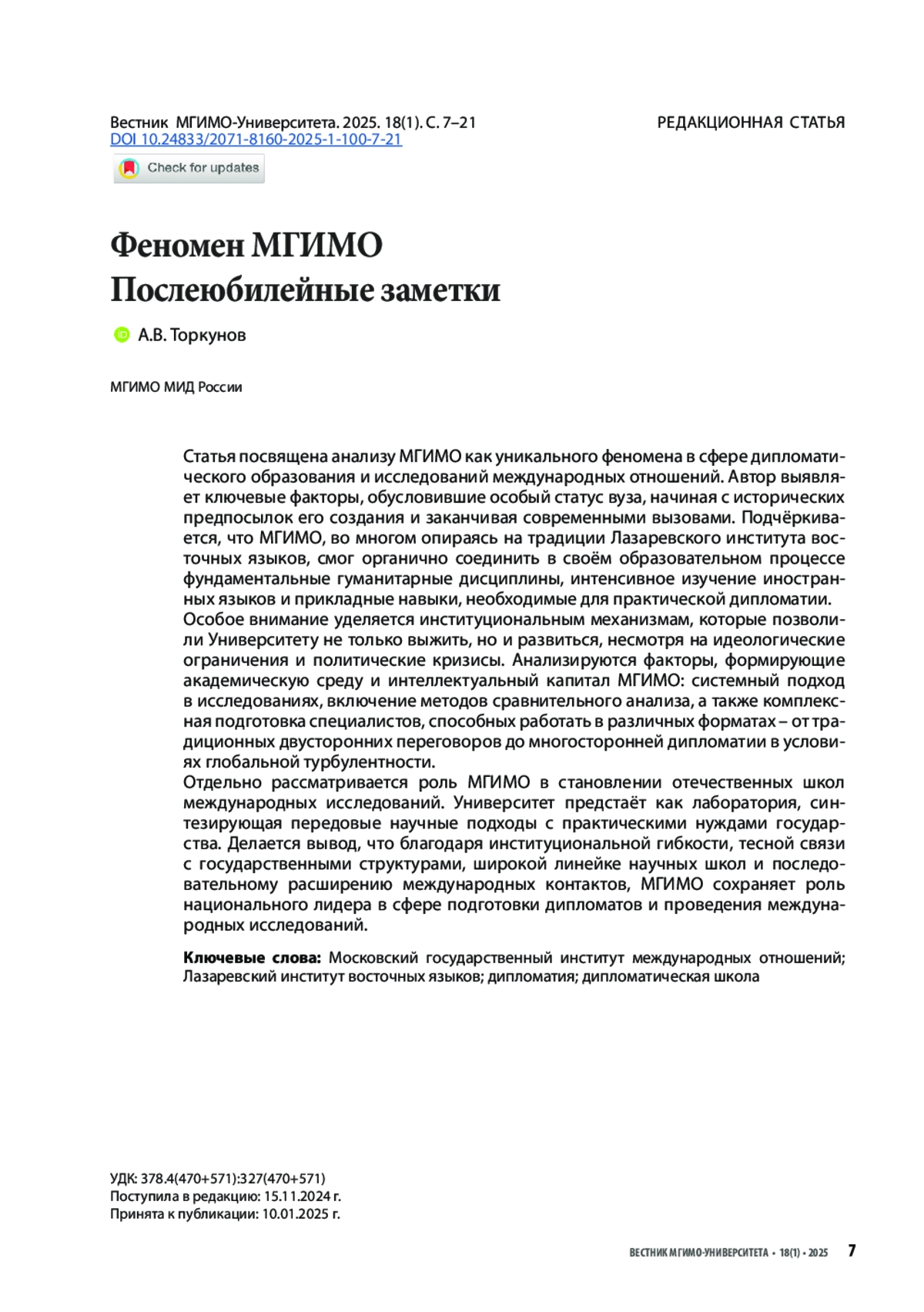 Статья посвящена анализу МГИМО как уникального феномена в сфере дипломатического образования и исследований международных отношений. Автор выявляет ключевые факторы, обусловившие особый статус вуза, начиная с исторических предпосылок его создания и заканчивая современными вызовами. Подчёркивается, что МГИМО, во многом опираясь на традиции Лазаревского института восточных языков, смог органично соединить в своём образовательном процессе фундаментальные гуманитарные дисциплины, интенсивное изучение иностранных языков и прикладные навыки, необходимые для практической дипломатии. Особое внимание уделяется институциональным механизмам, которые позволили университету не только выжить, но и развиться, несмотря на идеологические ограничения и политические кризисы. Анализируются факторы, формирующие академическую среду и интеллектуальный капитал МГИМО: системный подход в исследованиях, включение методов сравнительного анализа, а также комплексная подготовка специалистов, способных работать в различных форматах – от традиционных двусторонних переговоров до многосторонней дипломатии в условиях глобальной турбулентности. Отдельно рассматривается роль МГИМО в становлении отечественных школ международных исследований. Университет предстаёт как лаборатория, синтезирующая передовые научные подходы с практическими нуждами государства. Делается вывод, что благодаря институциональной гибкости, тесной связи с государственными структурами, широкой линейке научных школ и последовательному расширению международных контактов, МГИМО сохраняет роль национального лидера в сфере подготовки дипломатов и проведения международных исследований.