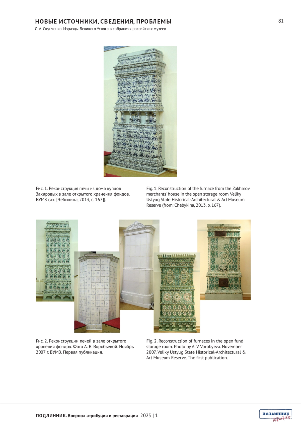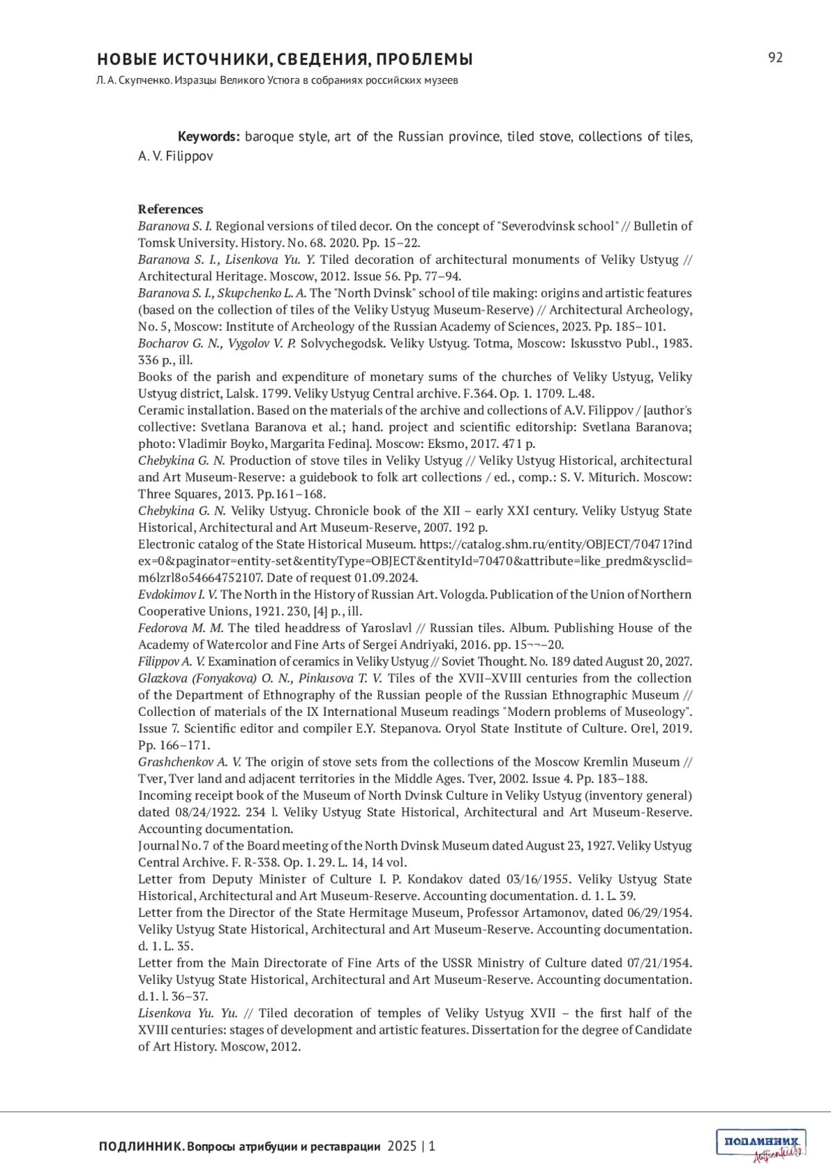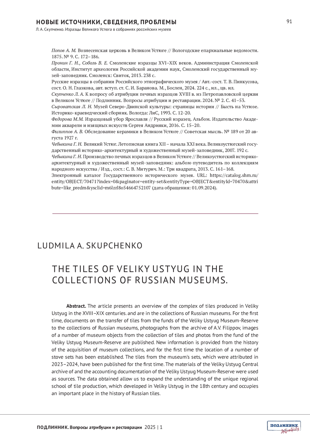 28. Скупченко Л. А. К вопросу об атрибуции печных изразцов XVIII в. из Петропавловской церкви в Великом Устюге // Подлинник. Вопросы атрибуции и реставрации. 2024. № 2. С. 41-53.