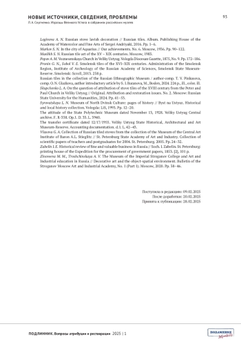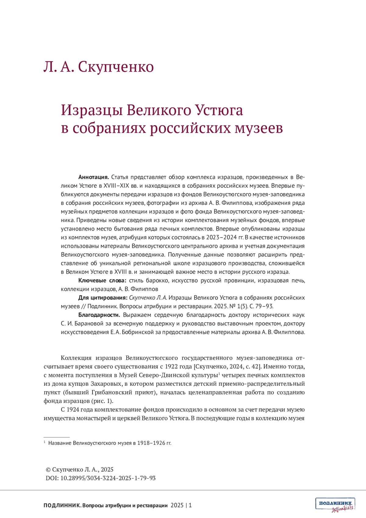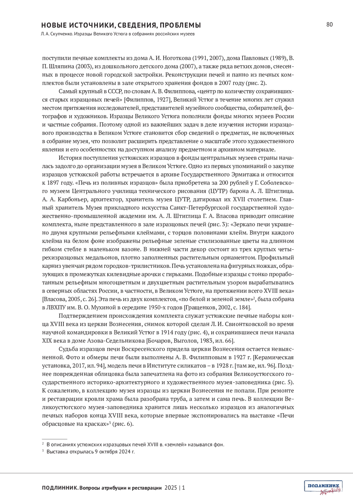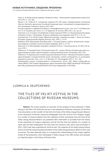 28. Скупченко Л. А. К вопросу об атрибуции печных изразцов XVIII в. из Петропавловской церкви в Великом Устюге // Подлинник. Вопросы атрибуции и реставрации. 2024. № 2. С. 41-53.