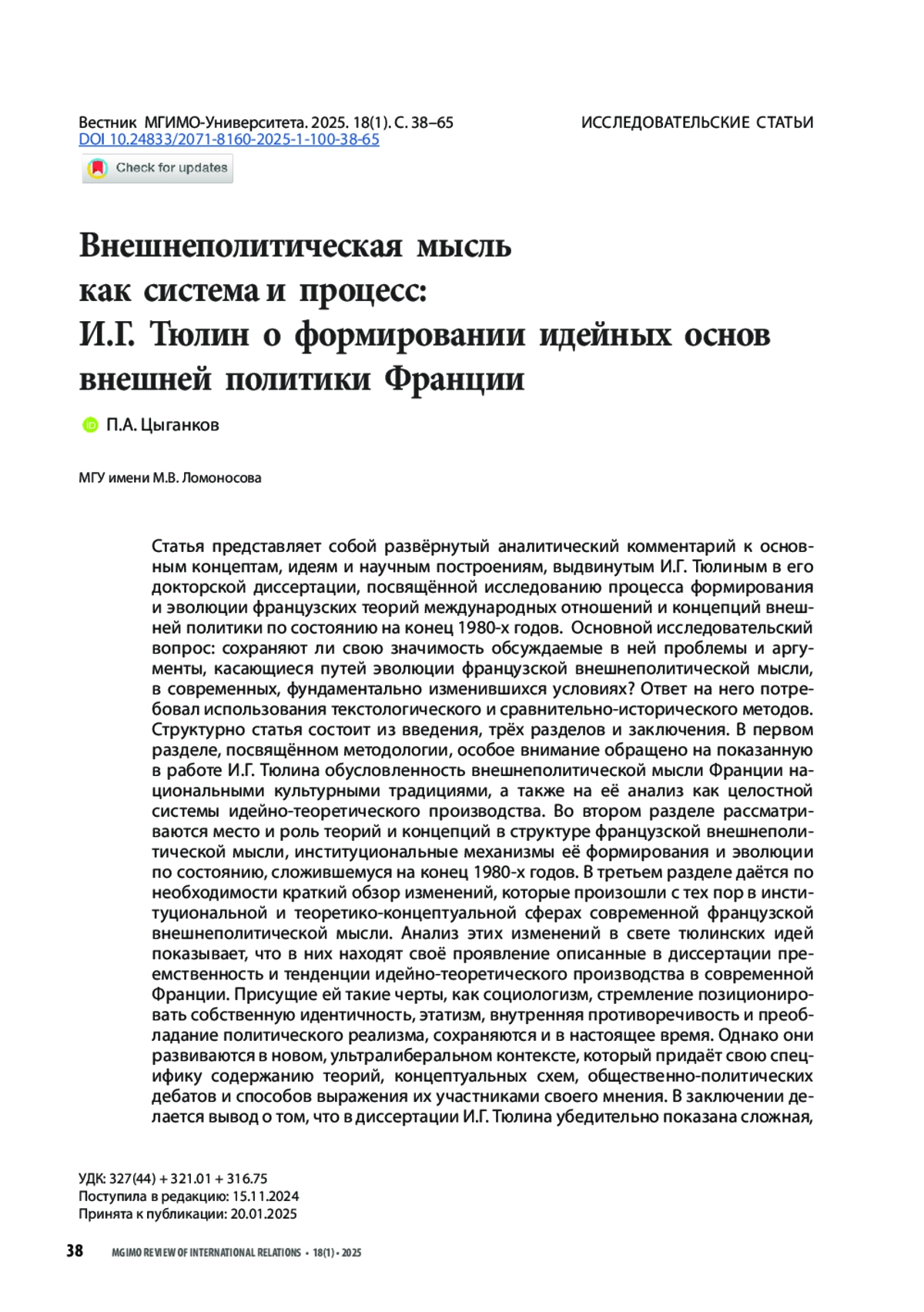 36. Тюлин И.Г. 1989. Процесс формирования и эволюции современных французских теорий международных отношений и концепций внешней политики. Диссертация на соискание ученой степени доктора политических наук. Москва. 357 с.