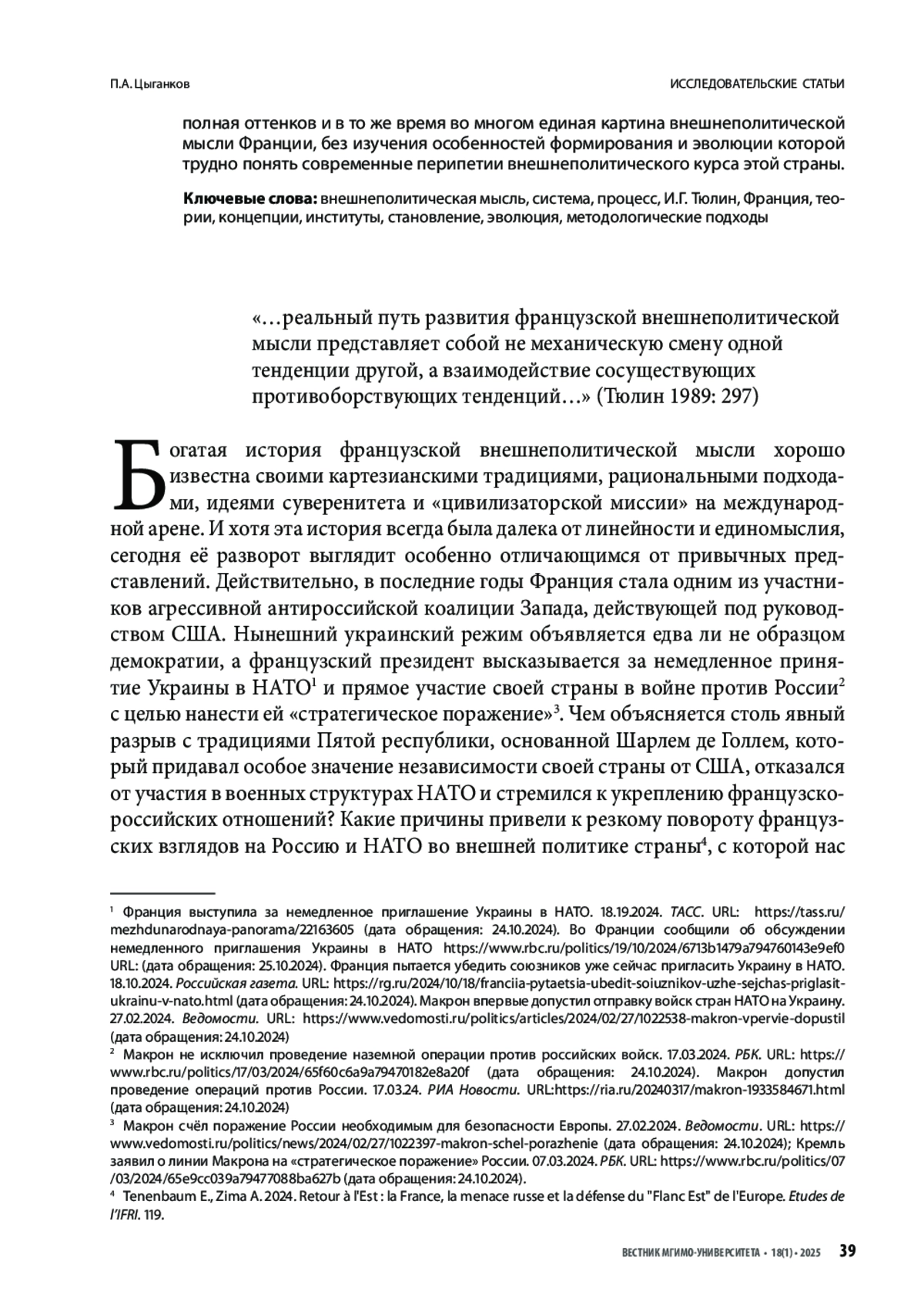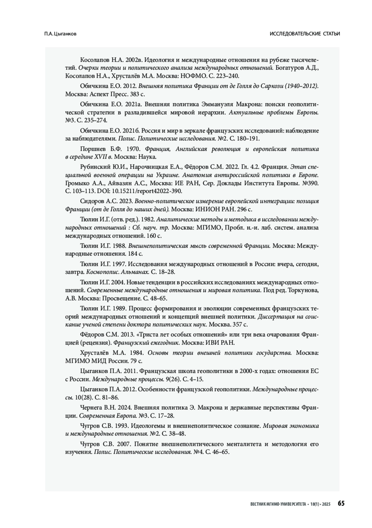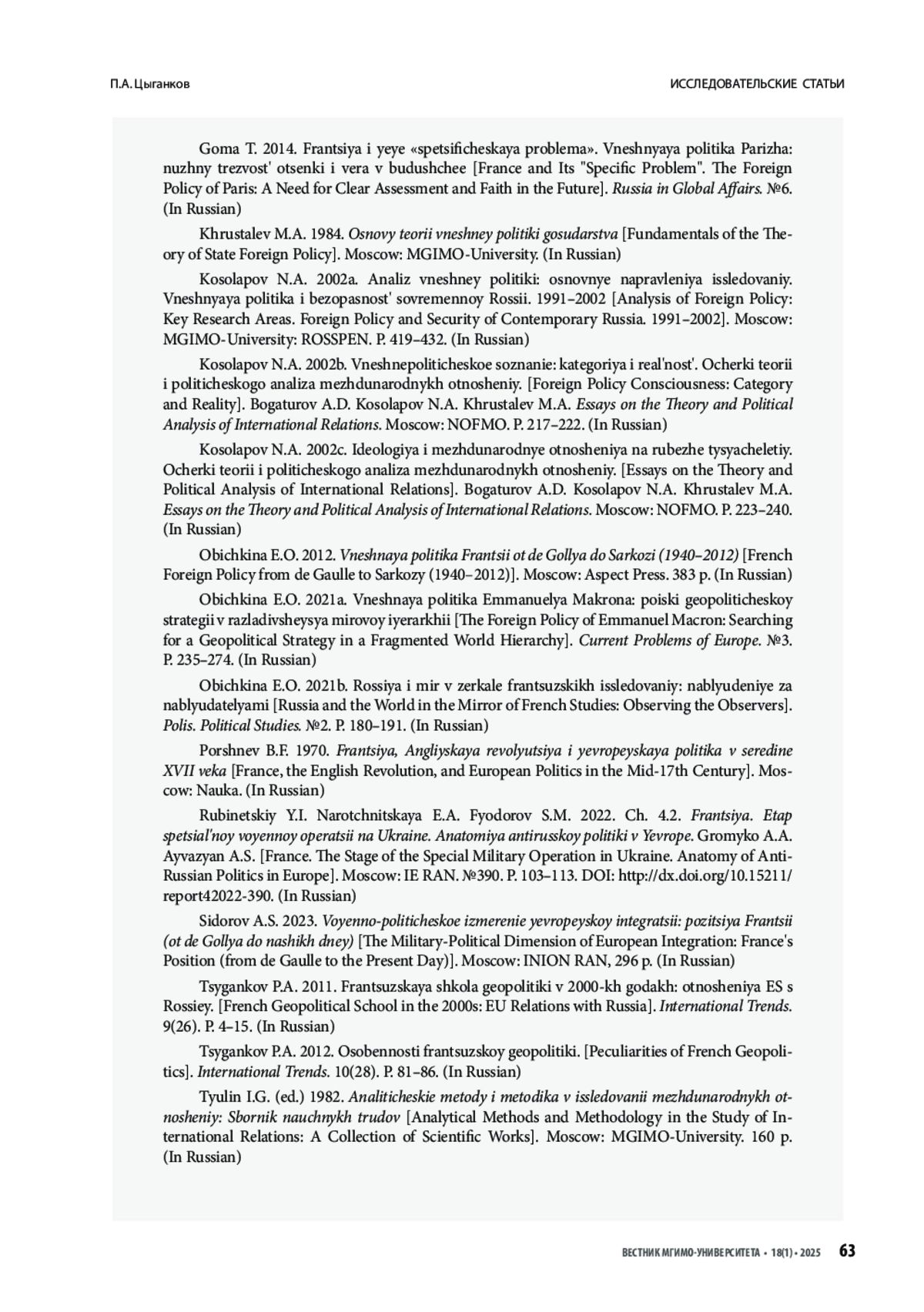 40. Цыганков П.А. 2012. Особенности французской геополитики. Международные процессы. 10(28): 81-86.