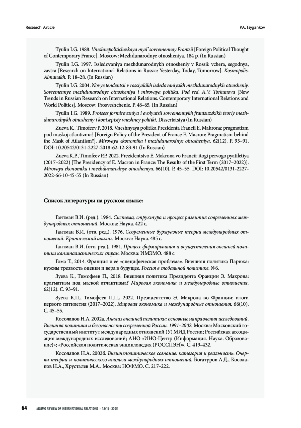 23. Зуева К.П., Тимофеев П.П., 2022. Президентство Э. Макрона во Франции: итоги первого пятилетия (2017-2022). Мировая экономика и международные отношения. 66(10), с. 45-55. Косолапов Н.А., 2002a. Анализ внешней политики: основные направления исследований. Внешняя политика и безопасность современной России. 1991-2002. Москва: Московский государственный институт международных отношений (У) МИД России; Российская ассоциация международных исследований; АНО «ИНО-Центр (Информация. Наука. Образование)»; «Российская политическая энциклопедия (РОССПЭН)». C. 419-432.