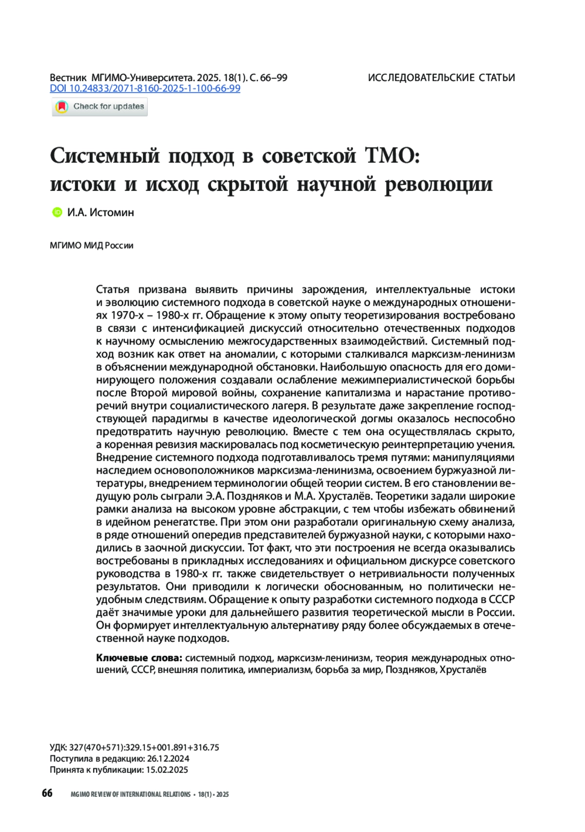 Статья призвана выявить причины зарождения, интеллектуальные истоки и эволюцию системного подхода в советской науке о международных отношениях 1970-х–1980-х гг. Обращение к этому опыту теоретизирования востребовано в связи с интенсификацией дискуссий относительно отечественных подходов к научному осмыслению межгосударственных взаимодействий. Системный подход возник как ответ на аномалии, с которыми сталкивался марксизм-ленинизм в объяснении международной обстановки. Наибольшую опасность для его доминирующего положения создавали ослабление межимпериалистической борьбы после Второй мировой войны, сохранение капитализма и нарастание противоречий внутри социалистического лагеря. В результате даже закрепление господствующей парадигмы в качестве идеологической догмы оказалось неспособно предотвратить научную революцию. Вместе с тем она осуществлялась скрыто, а коренная ревизия маскировалась под косметическую реинтерпретацию учения. Внедрение системного подхода подготавливалось тремя путями: манипуляциями наследием основоположников марксизма-ленинизма, освоением буржуазной литературы, внедрением терминологии общей теории систем. В его становлении ведущую роль сыграли Э. А. Поздняков и М. А. Хрусталёв. Теоретики задали широкие рамки анализа на высоком уровне абстракции, с тем чтобы избежать обвинений в идейном ренегатстве. При этом они разработали оригинальную схему анализа, в ряде отношений опередив представителей буржуазной науки, с которыми находились в заочной дискуссии. Тот факт, что эти построения не всегда оказывались востребованы в прикладных исследованиях и официальном дискурсе советского руководства в 1980-х гг. также свидетельствует о нетривиальности полученных результатов. Они приводили к логически обоснованным, но политически неудобным следствиям. Обращение к опыту разработки системного подхода в СССР даёт значимые уроки для дальнейшего развития теоретической мысли в России. Он формирует интеллектуальную альтернативу ряду более обсуждаемых в отечественной науке подходов.
