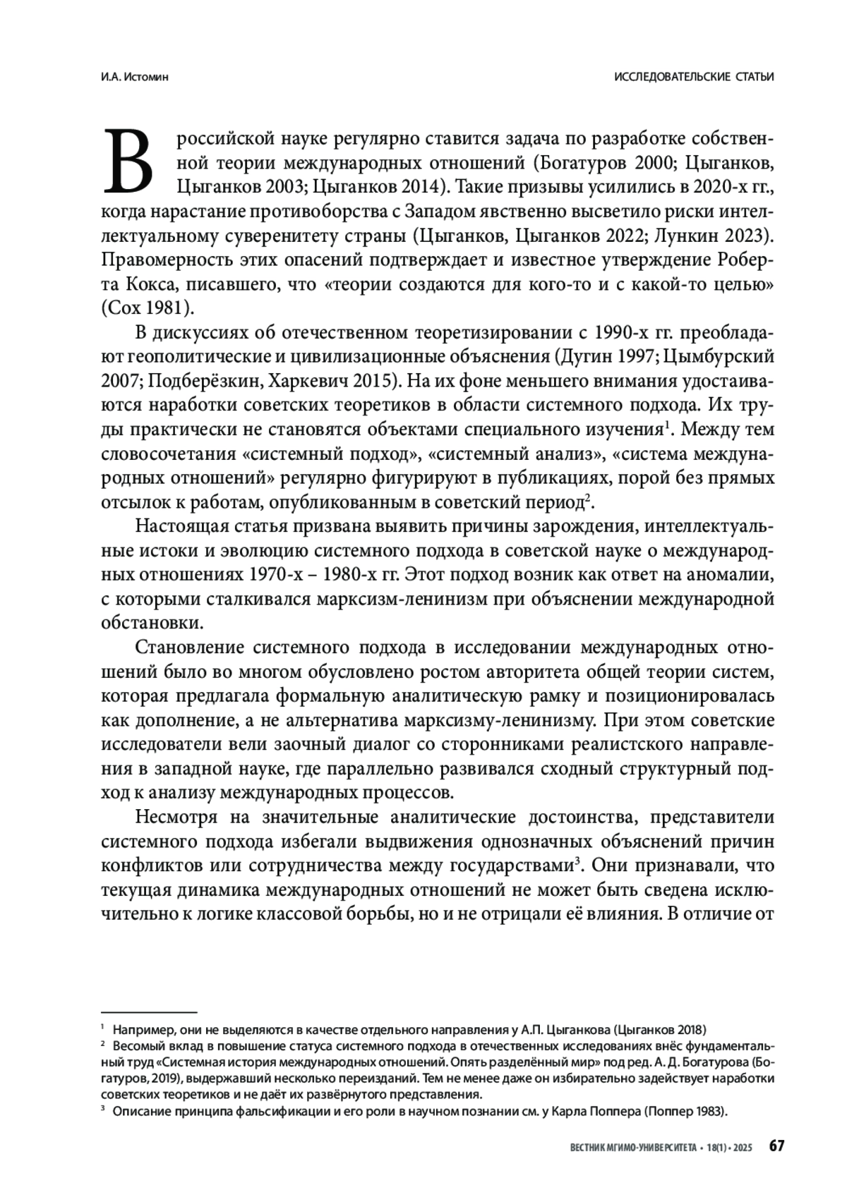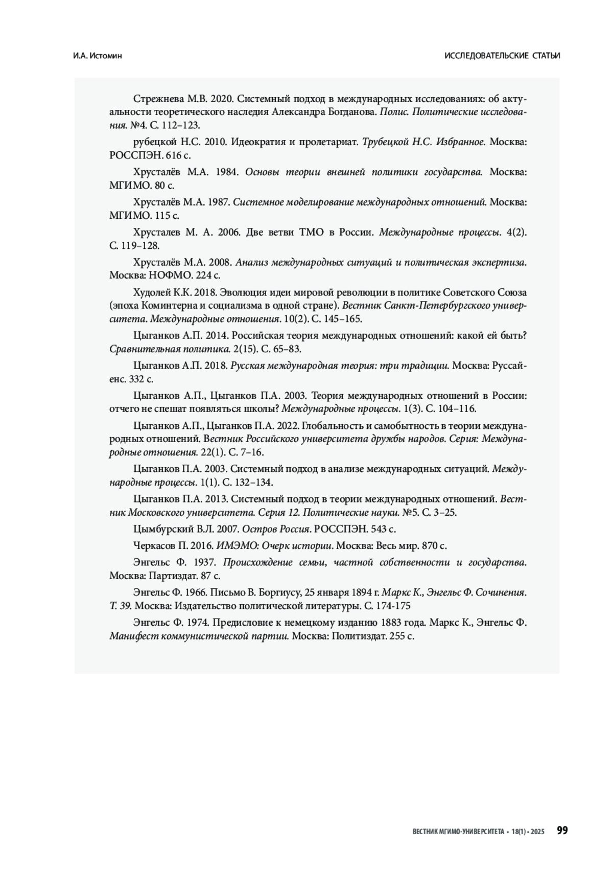 57. Цыганков П.А. 2003. Системный подход в анализе международных ситуаций. Международные процессы. Т. 1. № 1. С. 132-134.
