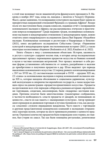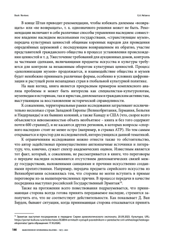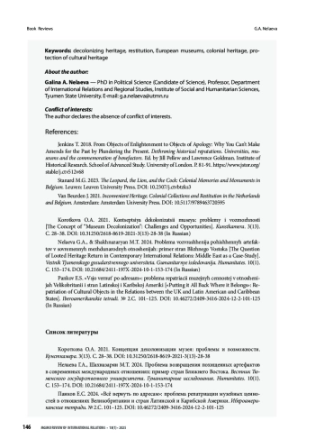 5. Нелаева Г. А., Шахназарян М. Т. 2024. Проблема возвращения похищенных артефактов в современных международных отношениях: пример стран Ближнего Востока. Вестник Тюменского государственного университета. Гуманитарные исследования. Humanitates. 10(1). С. 153-174. https://doi.org/10.21684/2411-197X-2024-10-1-153-174