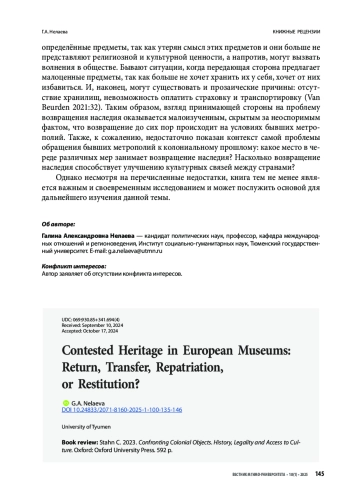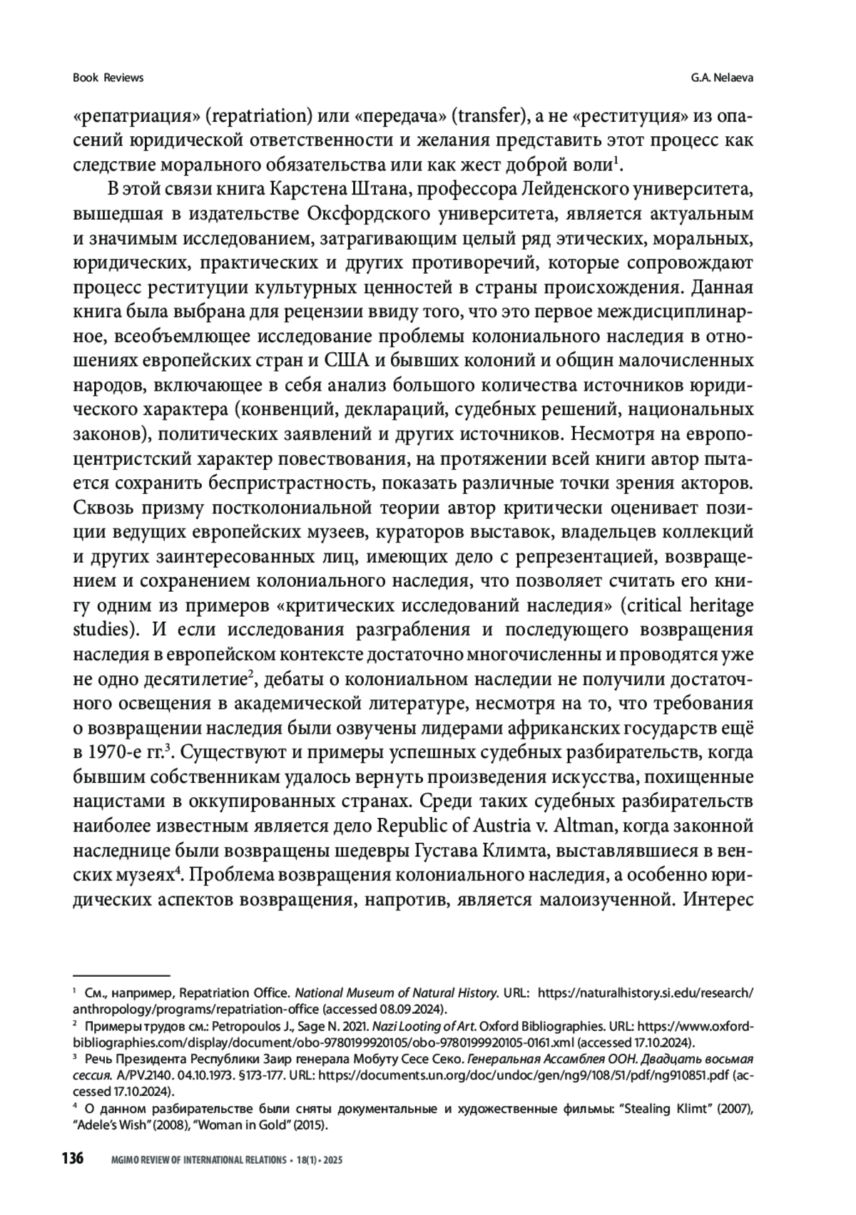 Рецензия на книгу: Stahn C. Confronting Colonial Objects. History, Legality and Access to Culture. Oxford: OUP, 2023. 592 p.