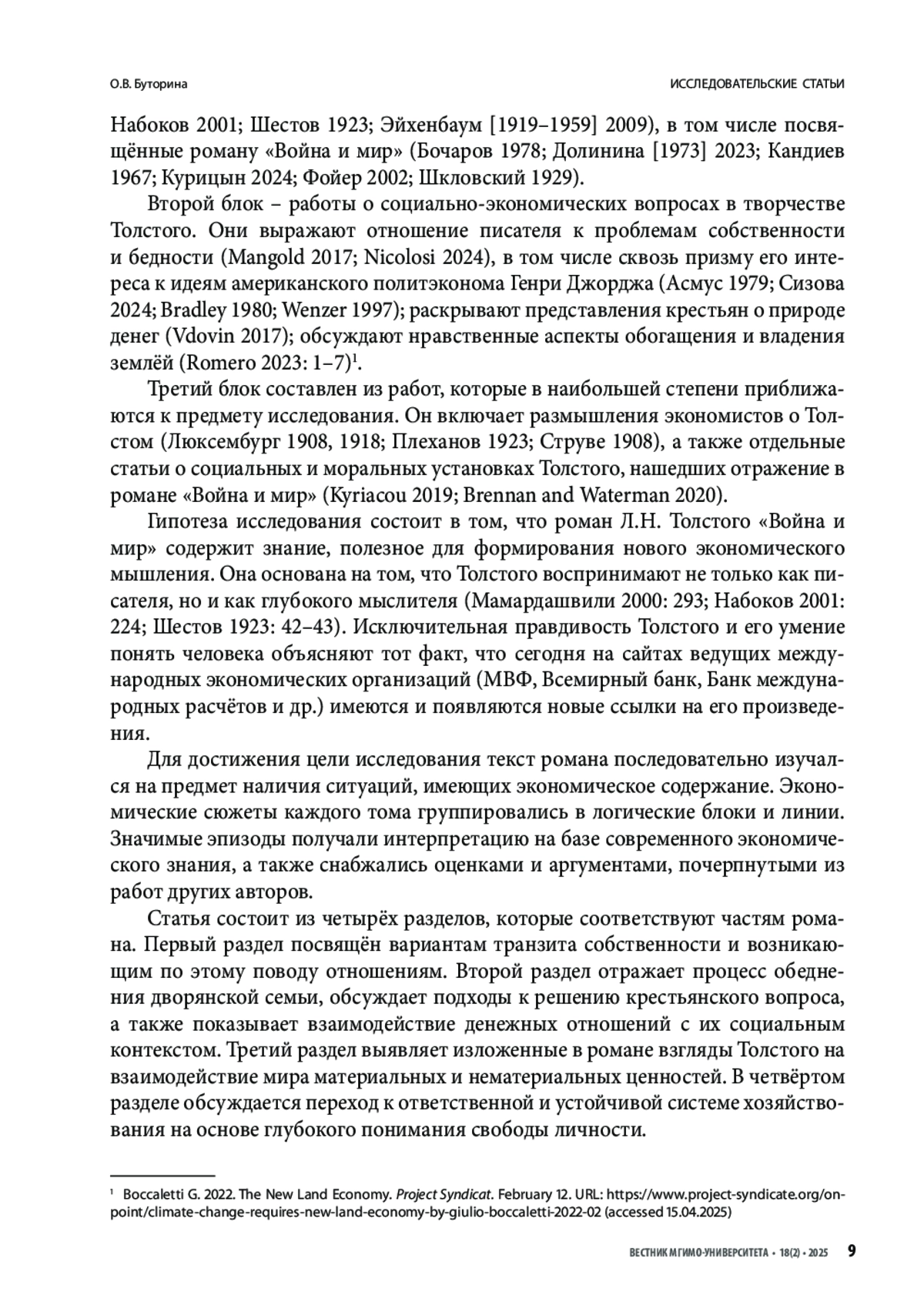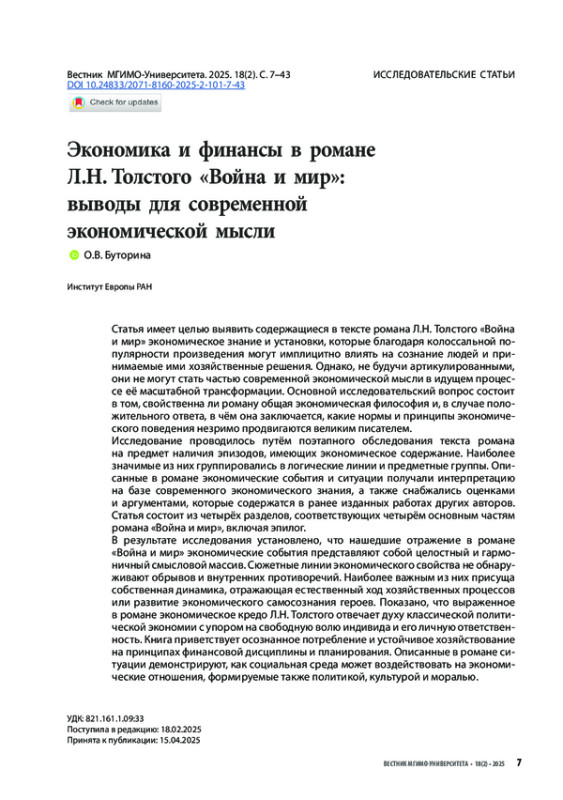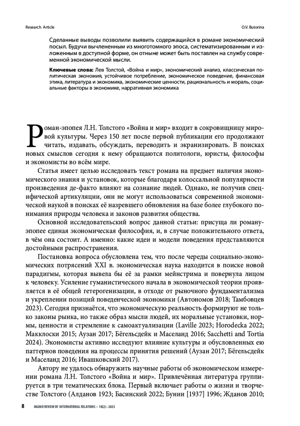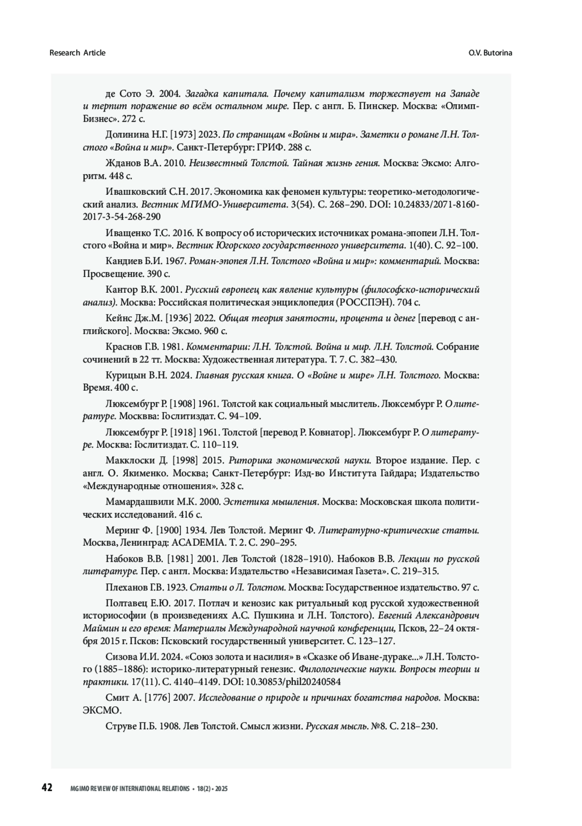 3. Brennan G. and Waterman A.M.C. 2021. Economics Meets War and Peace Tolstoy’s Implicit Social Theory. The Independent Review. A Journal of Political Economy. 3(25). P. 397-410.